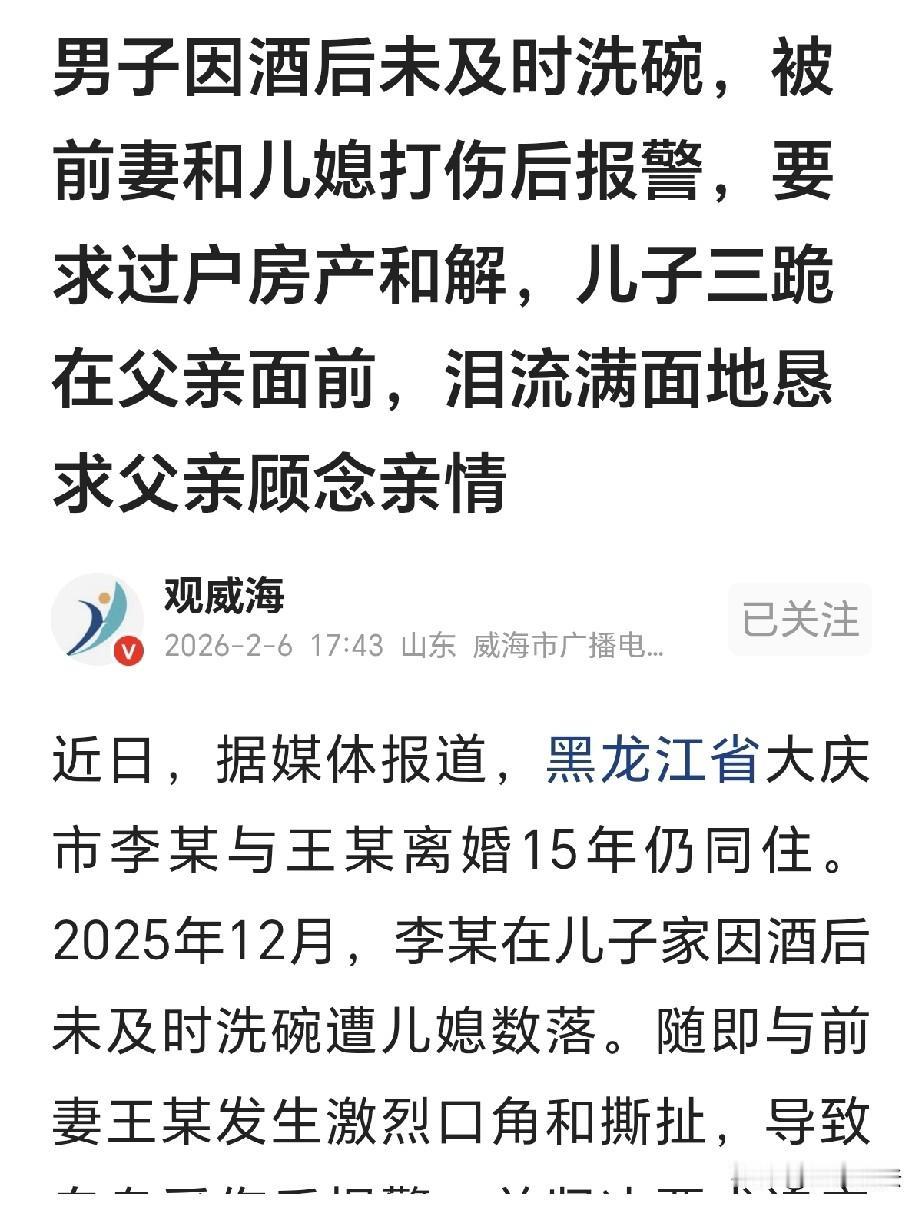 女人如老虎!黑龙江大庆,一男子离婚15年还和前妻同住,他喝完酒后没及时刷碗,儿媳忍不住数落他几句,前妻护着儿媳,和他吵了起来,谁知她们婆媳二人,竟然合伙揍了他一顿,男子越想越气,报警追究她俩的责任,儿子求情,要他放过妻子和母亲,男子提出,要想不追究责任,儿子必须过户给他一套房子,儿子拒绝,3次给他跪下,要他顾念亲情,别让这个家给散了,结果令人意外! 李某离婚不离家,依旧和前妻同住,这一住就是15年,前妻对他十分的厌弃。 李某忍气吞声,每天过得是如履薄冰,前妻对他没有好脸,动辄唠叨,对他满满都是恨意。 李某过得小心翼翼,但是他没有办法,他一旦走了,就会无家可归。 他遥想当年,也曾年轻有为,他辛辛苦苦,在外面打拼,没过多久,就攒了一笔积蓄。 李某洋洋得意,妻子王某和他商议,挣来的钱都去买了房子。 王某建议,把房子写在儿子名下,免得等他们老了,再过户时手续麻烦。 李某没有多想,反正儿子是独子,早过户晚过户都是过户,写在儿子名下,让他们娘俩放心就是。 可万万没有想到,没过几年,李某王某离婚了,可离婚痛快,离完李某就后悔了。 房子都在儿子名下,如果儿子撵他,他就无家可归! 他心里清楚,对儿子来说,从小被母亲带大,母亲王某才是他最亲之人。 更何况他年纪渐长,已经没有重来的机会,从此后他忍气吞声,离婚不离家,就这么稀里糊涂15年过去。 之后儿子长大,结婚娶妻,又给他生了大胖孙子,他就更不想走了 可王某作为妻子,心里自然也有主意,李某年轻时的荒唐,至今仍让她怨恨不已。 当年她生下儿子,辛苦操劳,可是在李某眼里,她的付出全是应该的。 这么多年,她受了天大的委屈,好在她提前部署,把房子全都写到了儿子的名下。 如今好不容易离婚,王某还赖在家里。 你既然不走,那就得听我。 他们到儿子家吃饭,买了不少的食品,到了儿子家里,王某和儿媳做了一桌的美食。 他们吃饭的时候,李某高兴,端起酒杯喝了不少,他喝完之后,脑子昏昏沉沉,他想休息,坐在那里一动不动。 饭菜吃完,桌子上一片狼藉,儿媳收拾,一堆脏碗放到了厨房池子。 王某要儿媳休息,要李某去厨房刷碗,李某嘴上答应,就是不动。 儿媳打扫完卫生,又去照顾孩子,眼看他坐那不动,忍不住数落他几句。 王某也向着儿媳,催促他赶快去洗, 李某委屈,借着酒胆和前妻吵了起来。 王某积怨已久,你不刷碗,你还有理? 眼看俩人打了起来,儿媳冲过来帮忙,俩人把李某暴揍了一顿! 李某彻底恼了,老的不尊重他,小的也不尊重他,他成了出气筒,这个日子没法过了! 他拿出电话就报了警,要求让前妻和儿媳承担责任。 儿子慌了,连忙求情: 爸 你可不敢报警,你要是追究,这个家就散了! 到时候我妈进去,我媳妇也进去,孩子咋办?我咋出去见人? 你儿媳留了案底,孩子们长大,会受影响,到时候孙子也不认你! 可李某提出,如果儿子想让他息事宁人,必须把儿子名下一套房子过户给自己! 那房子是自己掏钱买的,如果当年不是前妻坚持,根本不会落在儿子名下,如果归还给他,他就能再立门户。 儿子不愿意了,你都这么大的年纪,你就不要闹了。 如果你非要过户,那我们的亲情也会就此断了。 你不要儿子,难道还不要孙子?你就忍心让我们一家就这么散了? 儿子下跪3次,王某顿时没了脾气,他听儿子的话,似乎很有道理。 如果因为一时之气,让儿媳和前妻受到处罚,到时候儿子恨他,孙子恨他,他得不偿失,就会悔之晚已。 万一孤独终老,日子就更没了盼头,李某长叹一声,决心原谅他们。 有人认为,没死之前就不能把所有东西全部都给了妻儿,看看这位男人多惨,就像寄人篱下,吃个饭都要洗碗,洗晚了还要挨揍! 也有人说,换作是我,早就离开这个家了,要像战败的狮王那样,宁可死在荒野,也要保持住最后的体面! 更有人说,这种人不值得同情,既然离婚了为什么还要住在一起啊?甚至儿媳妇都可以对你指手画脚?一定是做过啥亏心事!记住了,可怜之人必有可恨之处! 好在儿子代为道了歉,老头最终选择了原谅,如果真闹下去,这个家确实就彻底散了。 有人指责儿子,说儿子太怂,保护不了自己的父亲,可外人又不知道,李某年轻时都做了什么? 所以说做人还是要多一点善良,尤其是家庭成员之间,应该多一点理解和包容。 对此,你怎么看?欢迎评论区留言讨论。