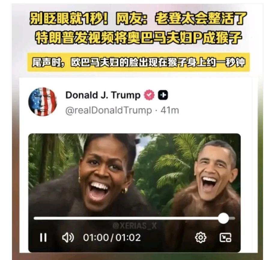 谁说老美没有种族歧视,特朗普就种族歧视奥巴马,因为他是黑娃混血,而不是红脖子,那么多美国总统,特朗普最多语言上调侃一下,到了奥巴马这里,直接把他的形象搞成了猴子,关键还把他老婆一起P成了猴子,如果是个人恩怨对奥巴马不就得了。