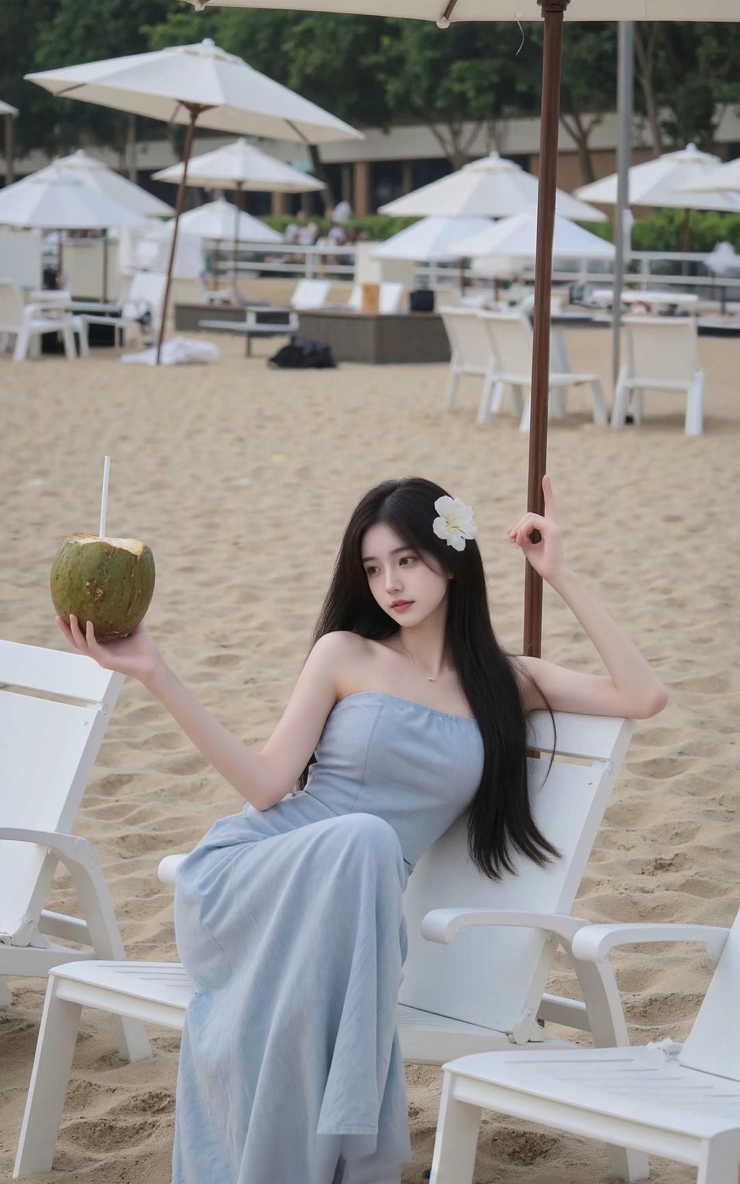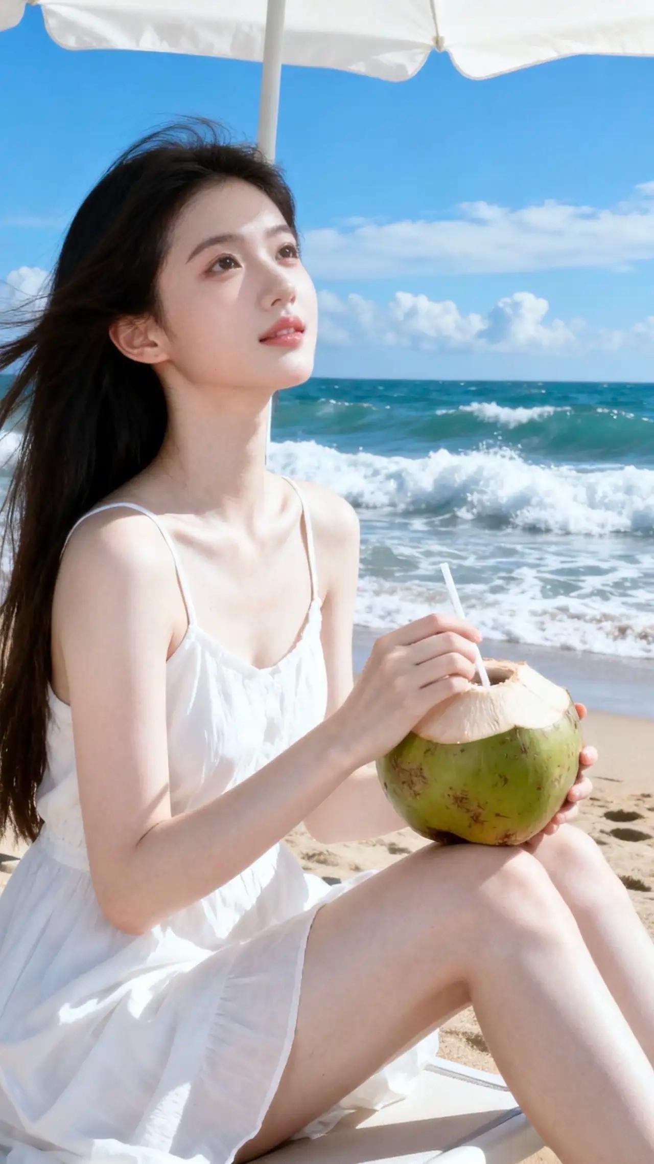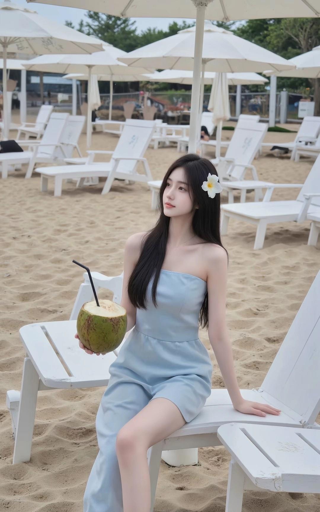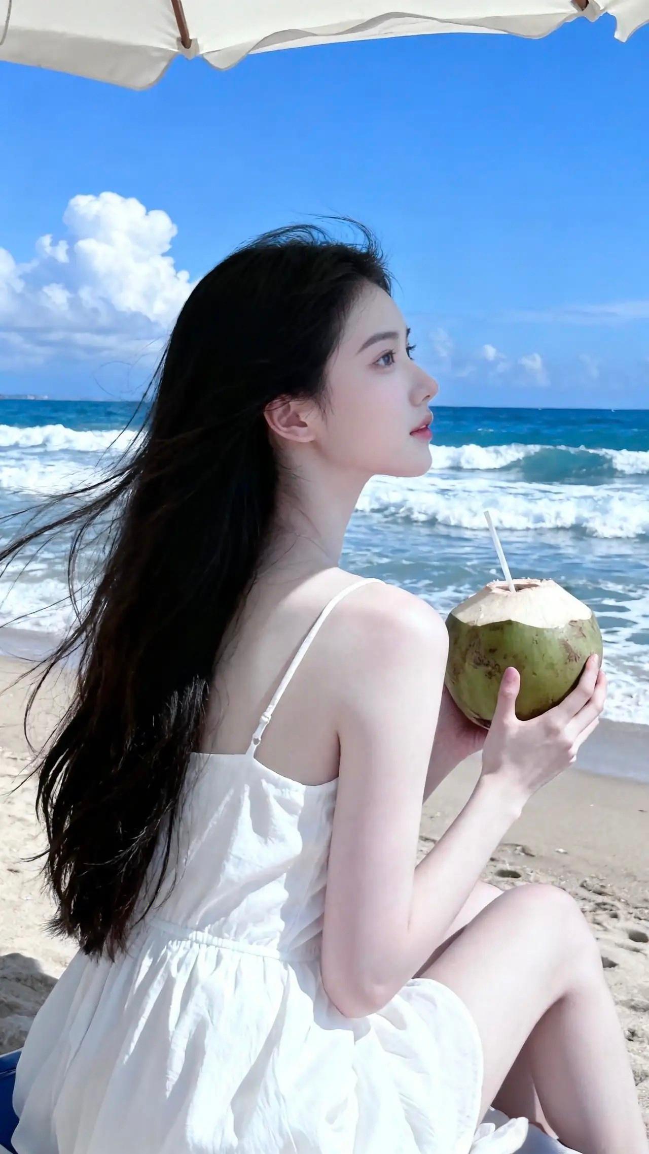 你在宁静的海边,安逸的享受着椰子水带来的美好时光。而出类拔萃的你,却是我眼中唯一最美、最靓丽、最迷人的风景线。