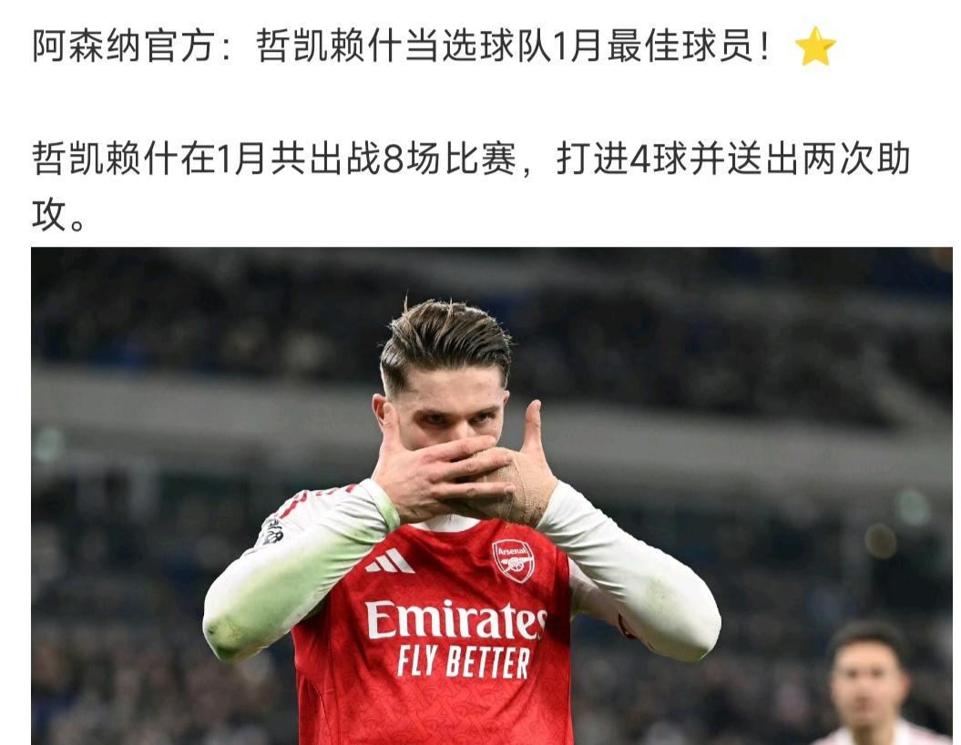 阿森纳一月份最佳是哲凯赖什!这样再表现两个月,阿森纳就拿英超冠军了。 一月份哈兰德烂尾,只有2球1助攻。 哲凯赖什4球2助攻,起码比争冠对手表现好。[得意]