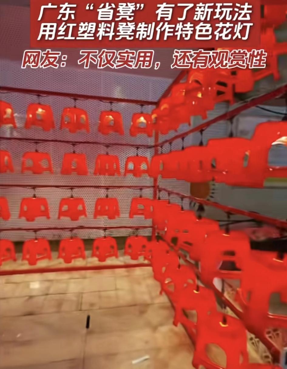 广东省被号称为省凳的红色塑料凳子,又被玩出了新花样,在佛山一处活动现场,短的矮的红色小凳子,一排排的整齐挂在栏杆上,就像一只红灯笼一样,非常喜庆。广东人家家户户必备的红色凳子,用处太大了,红色代表着喜庆,不管亲戚朋友聚会,还是大型的活动和宴食现场都少不了这种红色的凳子价钱不贵,而且非常的实用,平时在家门口坐着聊天,平时搞卫生用来垫高。