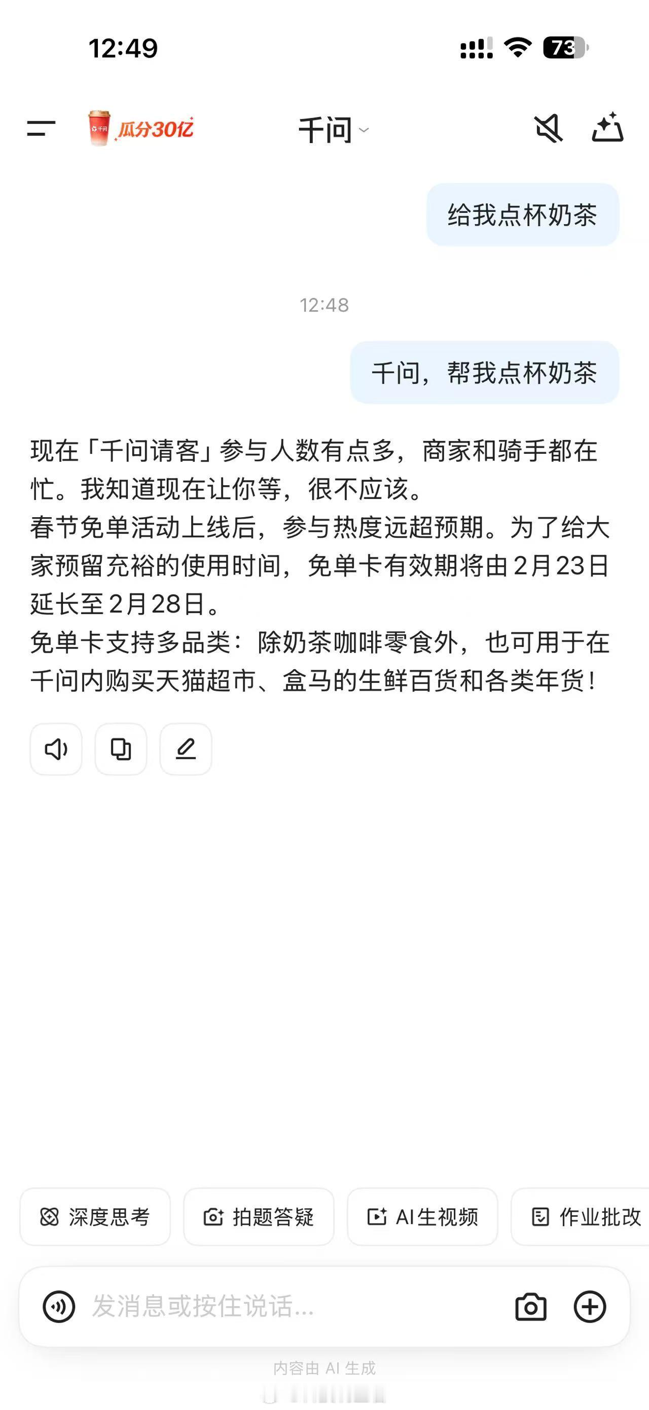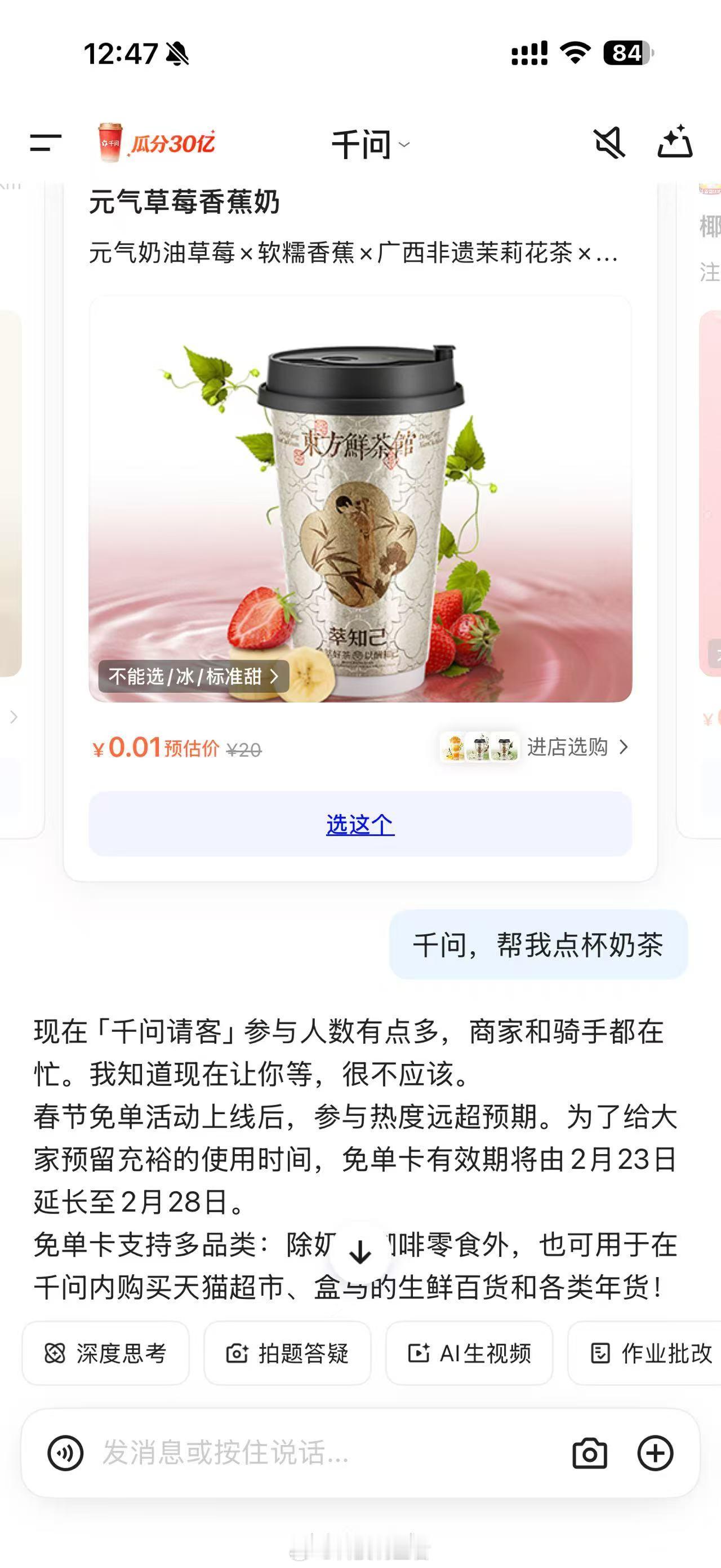 千问你是真狠啊,昨天的活动大家喝了几杯奶茶,反正我是喝奶茶都给干饱了,今天我请客给5个小伙伴点奶茶、肯德基、盒马怎么样?千问