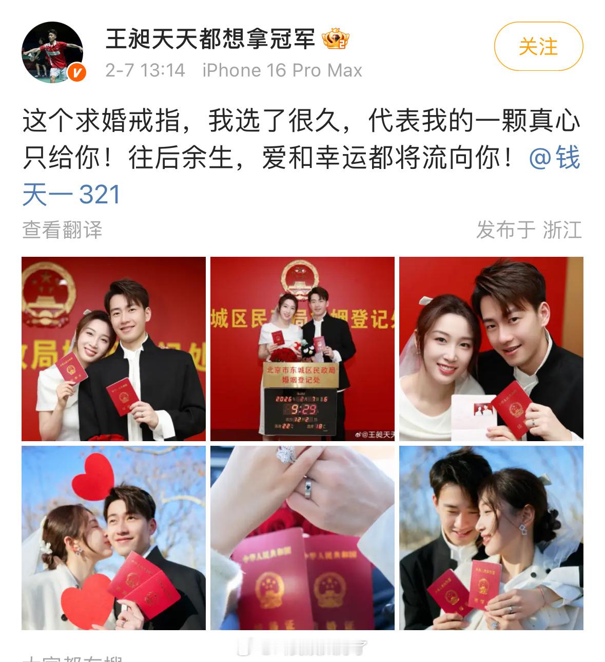 羽毛球的王昶和乒乓球的钱天一俩人领证结婚了。两个人颜值都挺高的,祝福祝福
