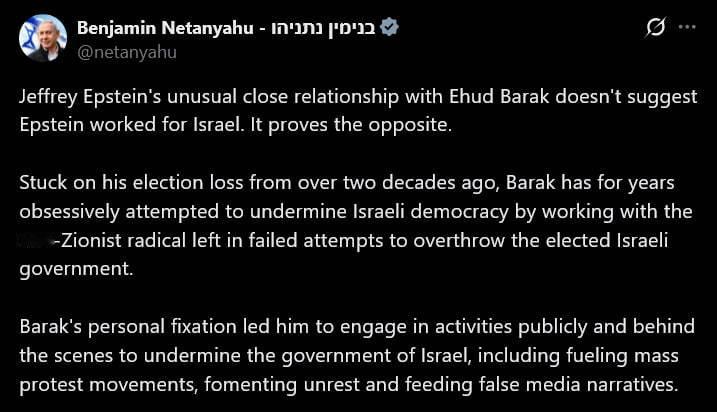 内塔尼亚胡承认杰弗里·爱泼斯坦与前以色列总理埃胡德·巴拉克“有着特殊亲密的关系”