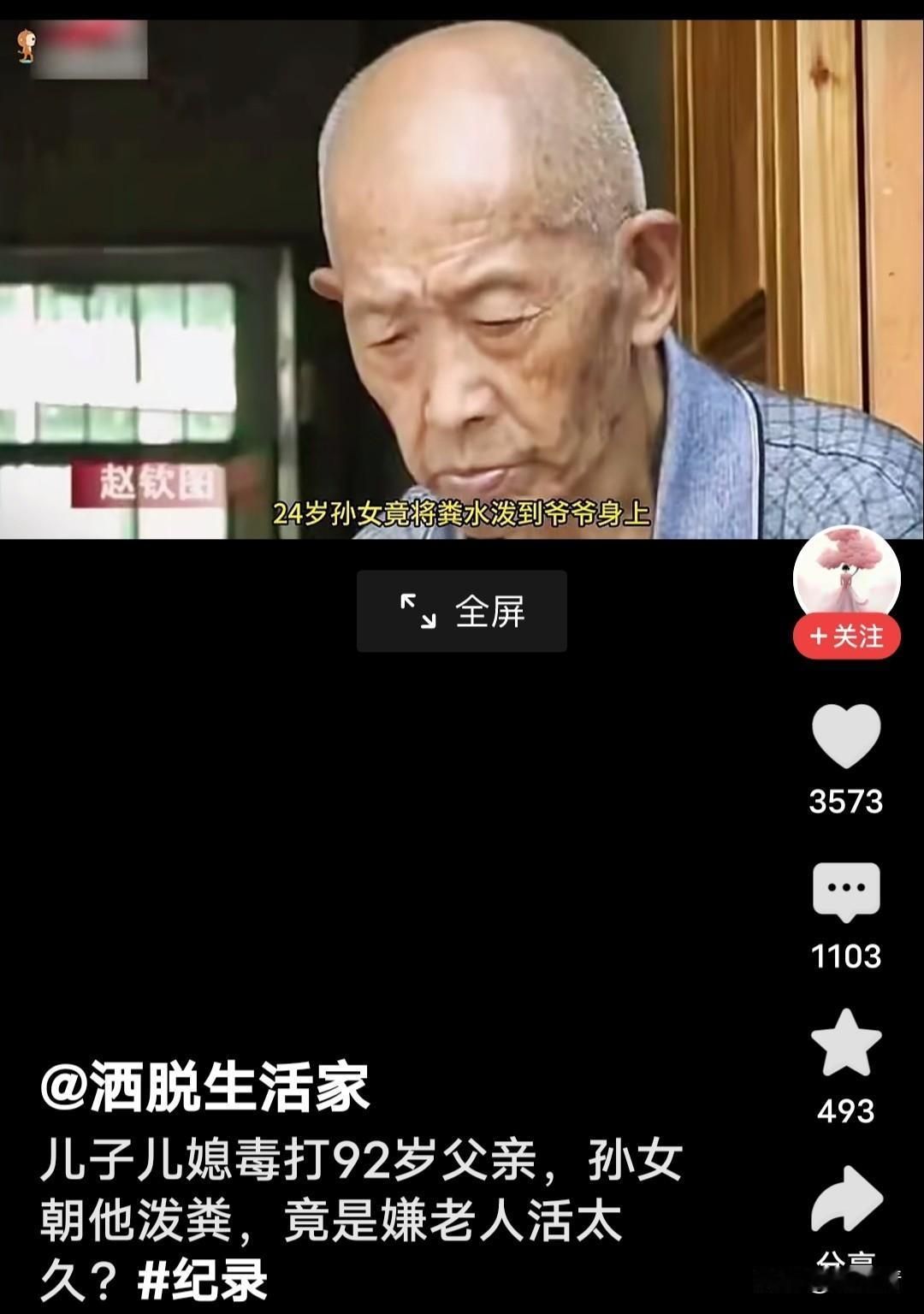 这家人太过分!儿子、儿媳妇虐待92岁老父亲,24岁孙女往爷爷身上泼粪。老爷子犯啥天条了。 92岁的老人属于耄耋之年,他没有犯啥错误,而且头脑清晰、身上穿的干干净净,更别说老年痴呆……。家人为啥虐待他?原来嫌他活的久。 老人的小女儿说,他太疼爱他的小孙女了,真想不明白,24岁侄女,往爷爷身上泼粪,咋能做出这样的事情? 网友评论,“有的人为了钱连自己的亲生父亲也毒打,儿子儿媳和孙女,没有人性,枉披一张人皮。” “说句心里话,年龄大了,如果能自理,尽量不要拖累家人,要有自知之明。” “有高额退休工资的老人是金蛋,没有养老金的老人是扯蛋。” “看到这个视频心里很难受,闺女、儿子媳妇、孙辈都有,怎么会这样呢?”