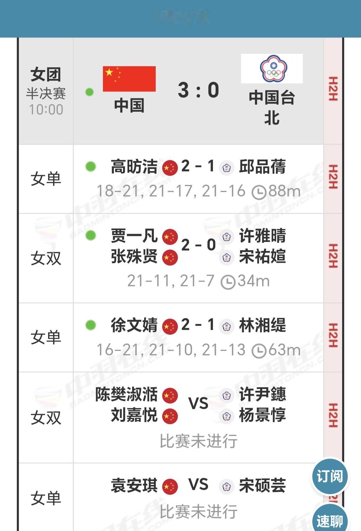 国羽女团两个女单太给力,均是先失一局连扳两局,助国羽女团3-0击败省队女团晋级决赛 第一场单打,国羽女团派出 排名第10位的高昉洁,第一局高昉洁慢热,纠缠几个回合后以18-21先丟一局,第二局高昉洁及时调整状态,最后以2 - 1(18-21, 21-17, 21-16)逆转战胜邱品蒨,为国羽女团取得一分。 第二场女双,奥运冠军贾一凡张殊状态火爆,快速以2-0(21-11,21-7)横扫世界排名15位的许雅晴/宋祐媗组合,为国羽女团再下一分,大比分2-0领先。 第三场二单,小将徐文婧对阵排名20位的林湘缇,首局徐文婧试探对手、手紧失误送分有点多,以16-21先失一局,第二局调整状态,并提速进攻掌控局势,快速以21-10拿下,决胜局开局同样是失误送分多,以2-5,6-9落后,小将徐文婧面对困难,不急不躁,耐心寻找机会,打出一波得分高朝并以11-9进入间歇,休息回来,攻势不减,继续扩大比分优势,林湘缇虽尽力追分,无奈徐文婧实力不俗,进攻、放网频频得手,最后以21-13再赢一局,最后以2-1逆转战胜对手,为国羽女团再取一分,助国羽3-0锁定胜利,晋级决赛。恭喜小将徐文婧,恭喜国羽女团晋级决赛!继续加油![赞][加油][点亮平安灯][烟花]