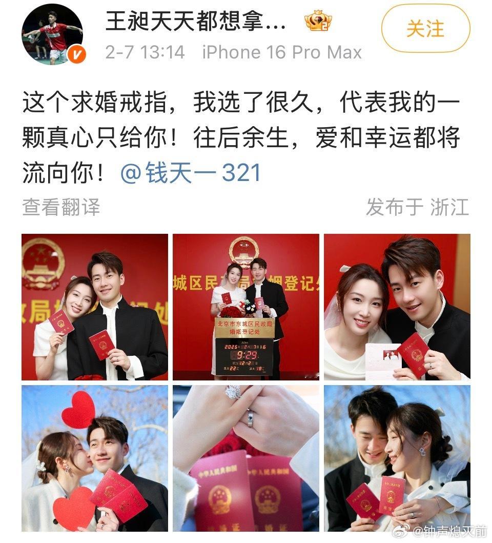 羽毛球的王昶和乒乓球的钱天一领证结婚了,好般配好幸福
