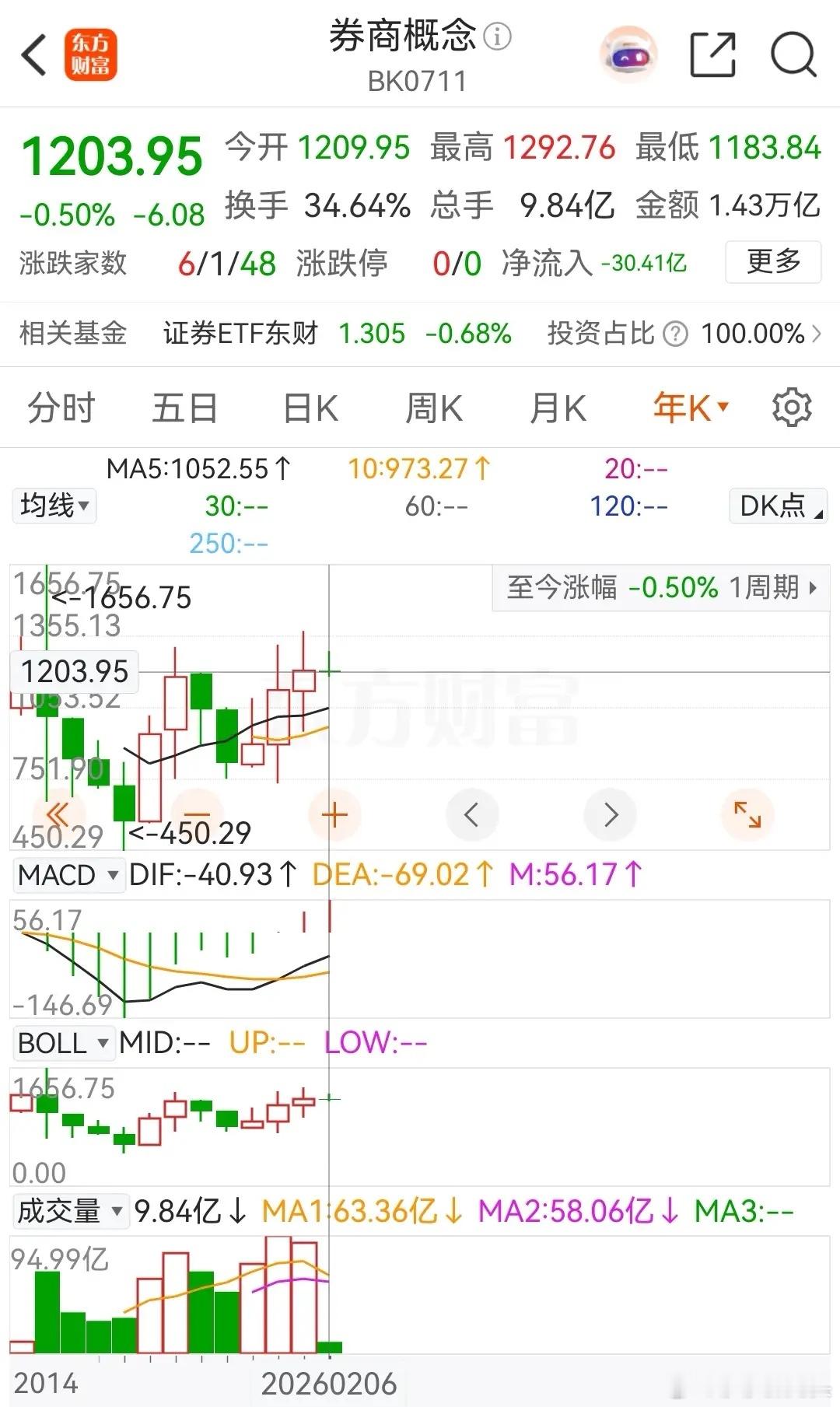 对于目前的券商概念板块,基本面有强力支撑,但是滞涨明显。券商概念板块2025年业绩普遍预增(中信证券净利增38.46% ,国泰海通预增超110% ),叠加1月份新增开户数同比暴增了213%至491.58万户、两融余额稳居2.74万亿高位,基本面处于上升周期。但是券商概念板块在年内涨幅显著落后于银行、白酒等 “老登股” ,甚至出现“指数涨、券商跌”的现象,引发了光大投资者的强烈不满。