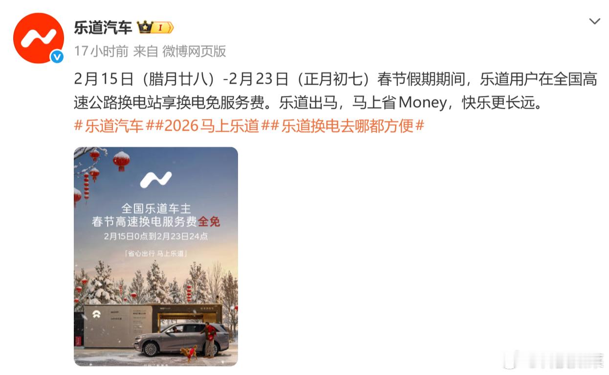 乐道宣布春节高速换电服务费2月15日-2月23日全免,这波春节福利够实在!开电车跑长途终于不用纠结补能成本了,就是不知道高速换电站的排队情况会不会因为免费变火爆?