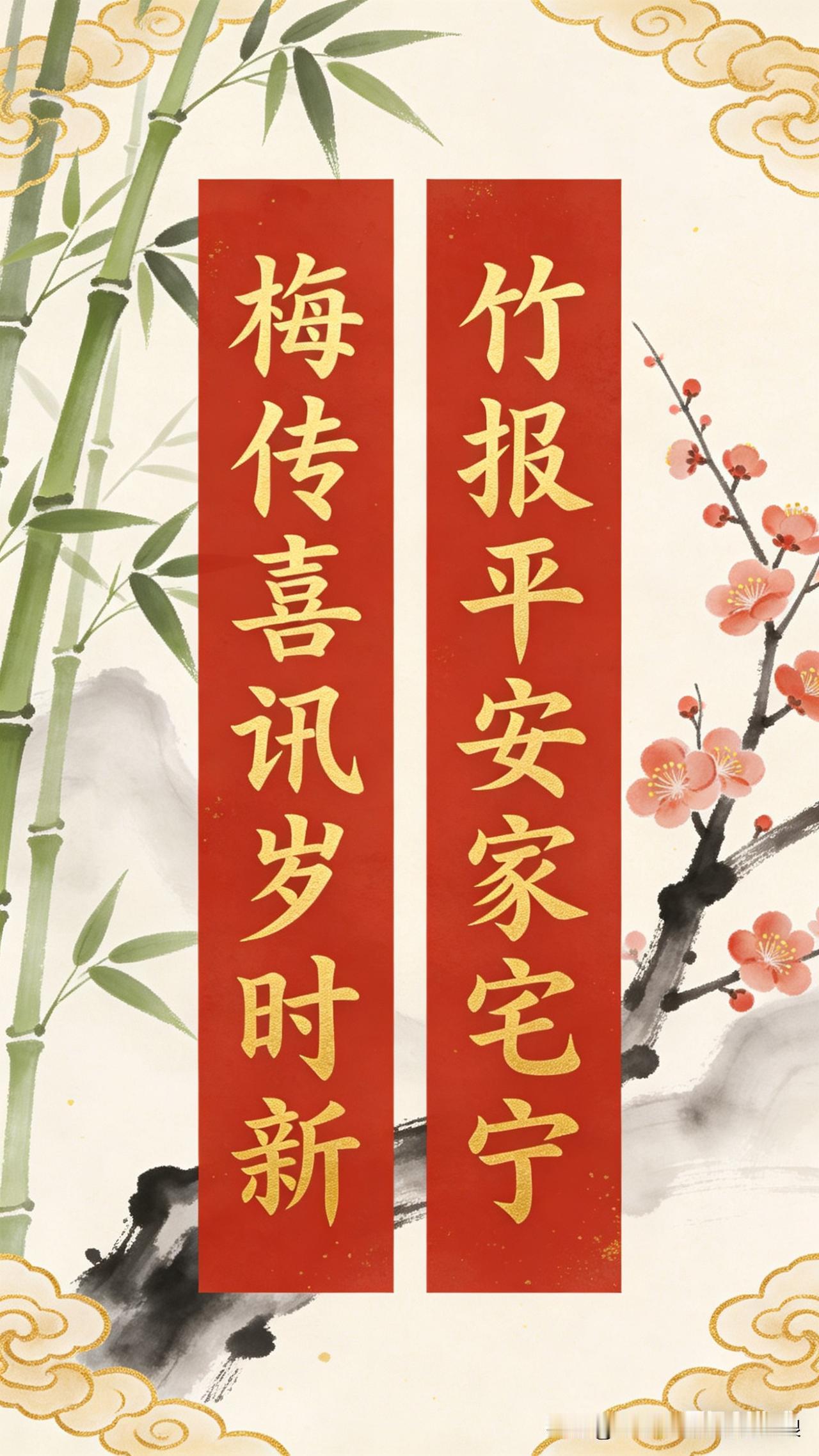 上联竹报平安家宅宁:竹自古有平安的美好寓意,此句是说竹子传递来平安的吉兆,家中宅院安宁和睦,家人平安顺遂。 下联梅传喜讯岁时新(原句缺字,补“新”为常规佳对):梅花在岁末年初绽放,带来吉祥的喜讯,寓意新的一年、新的时节迎来美好光景,万事顺遂。 两句对仗工整,以竹、梅两种吉祥意象,传递出阖家平安、新年纳福的美好祝愿,是新春祈福的经典联语。