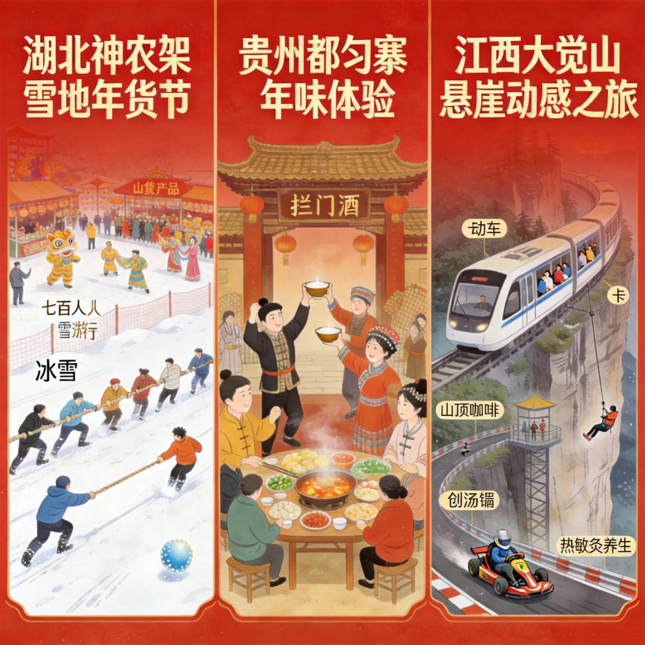 今年过年玩法也太野了吧!从南到北,各地文旅疯狂“整活”,直接把过年气氛拉满。 湖北神农架直接把年货节搬到了雪地里!雪地拔河、雪地运球,七百多人在冰天雪地里玩得那叫一个嗨。玩累了转身就是热热闹闹的年货集市,山货特产摆得满满当当,还有非遗表演可以看,这冷与热的碰撞,年味直接扑面而来。 贵州都匀的寨子里,进门先喝“拦门酒”,再跳个竹竿舞,一不小心还可能被“卡”住。五颜六色的饺子包起来,热气腾腾的刨汤宴摆起来,邻里乡亲聚在一块,那份纯粹的热闹劲儿,才是过年最地道的味道。 最绝的还是江西大觉山,居然把“动车”开到了悬崖上!坐在贴壁行驶的小车厢里,脚下是林海,旁边是峭壁,这视角太震撼了。下山还能开着“卡丁车”一路冲下去,玩的就是心跳。当地还配套搞了悬崖蹦极、山顶咖啡、热敏灸养生,这是要把人留在山里过年啊。 看来现在过年,早就不只是在家吃顿饭了。大家更想走出去,体验点不一样的、有烟火气的、或者带点刺激的新花样。今年春节,你打算去哪解锁一种新的过年方式呢?过年新玩法 文旅还能这么卷新年文旅活动 神农架玩雪攻略 春节趣味游戏 神农架冰雪 春节玩景点 春节趣味玩法 神农架冰雪季 春节假期玩法 春节游玩攻略 湖北过年游玩地 过新年的玩法 神农架弹幕游戏 春节文旅创意 春节文化游 新春游玩好处