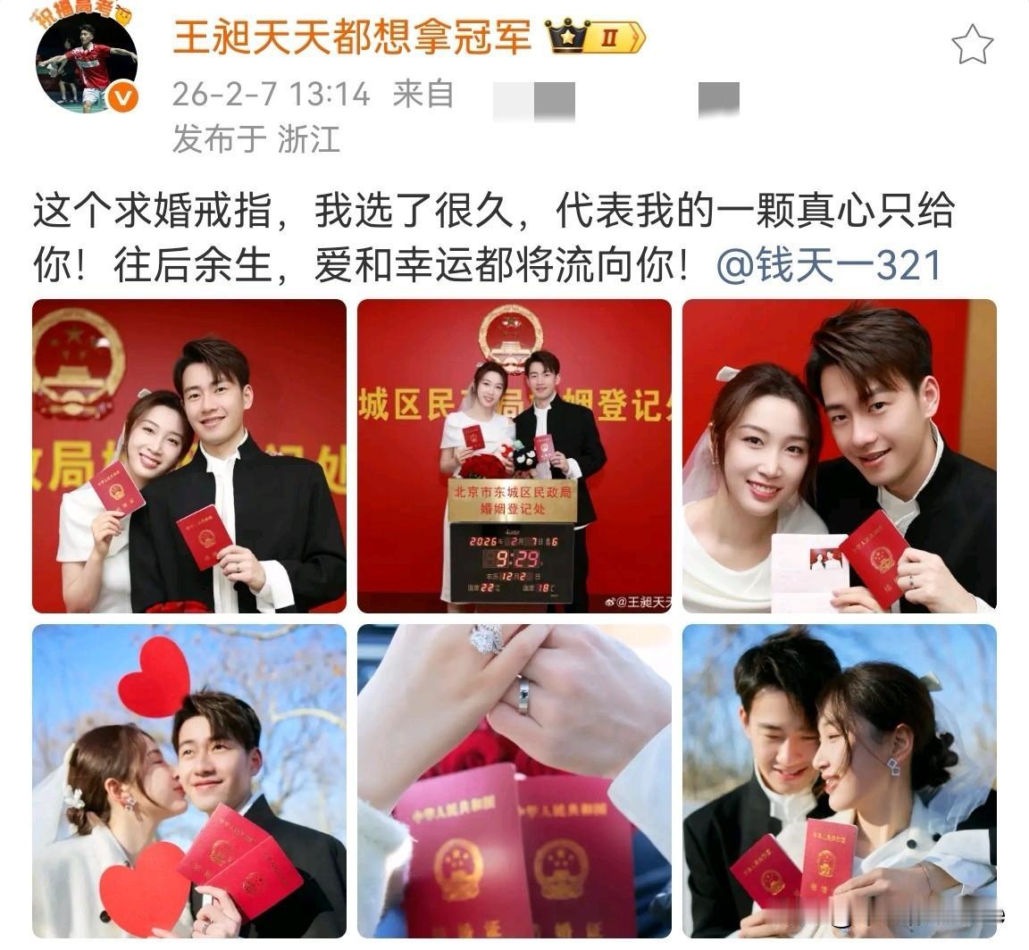 2月7日,羽毛球世界冠军王昶发文官宣与妻子钱天一的结婚喜讯,并配文“这个求婚戒指,我选了很久,代表我的一颗真心只给你!往后余生,爱和幸运都将流向你”。 王昶发了结婚登记照,钱天一发了王昶的求婚视频,祝两人新婚快乐。 王昶和钱天一是在北京东城区民政局登记结婚的,王昶身穿黑色西服,钱天一则穿的是白色短袖长裙,真是天造地设的一对。 只可惜王昶没有拿过奥运冠军,期待他继续征战下一届奥运会,大家觉得呢?