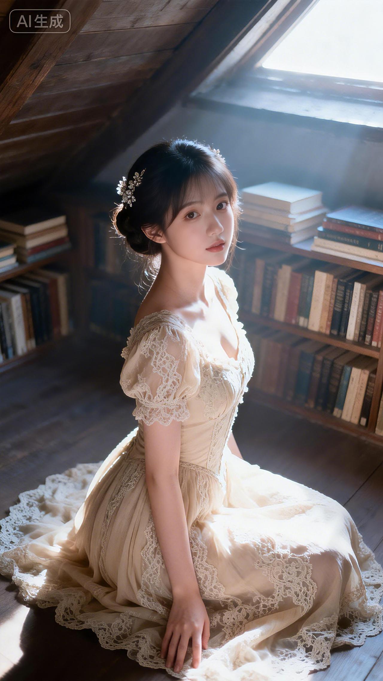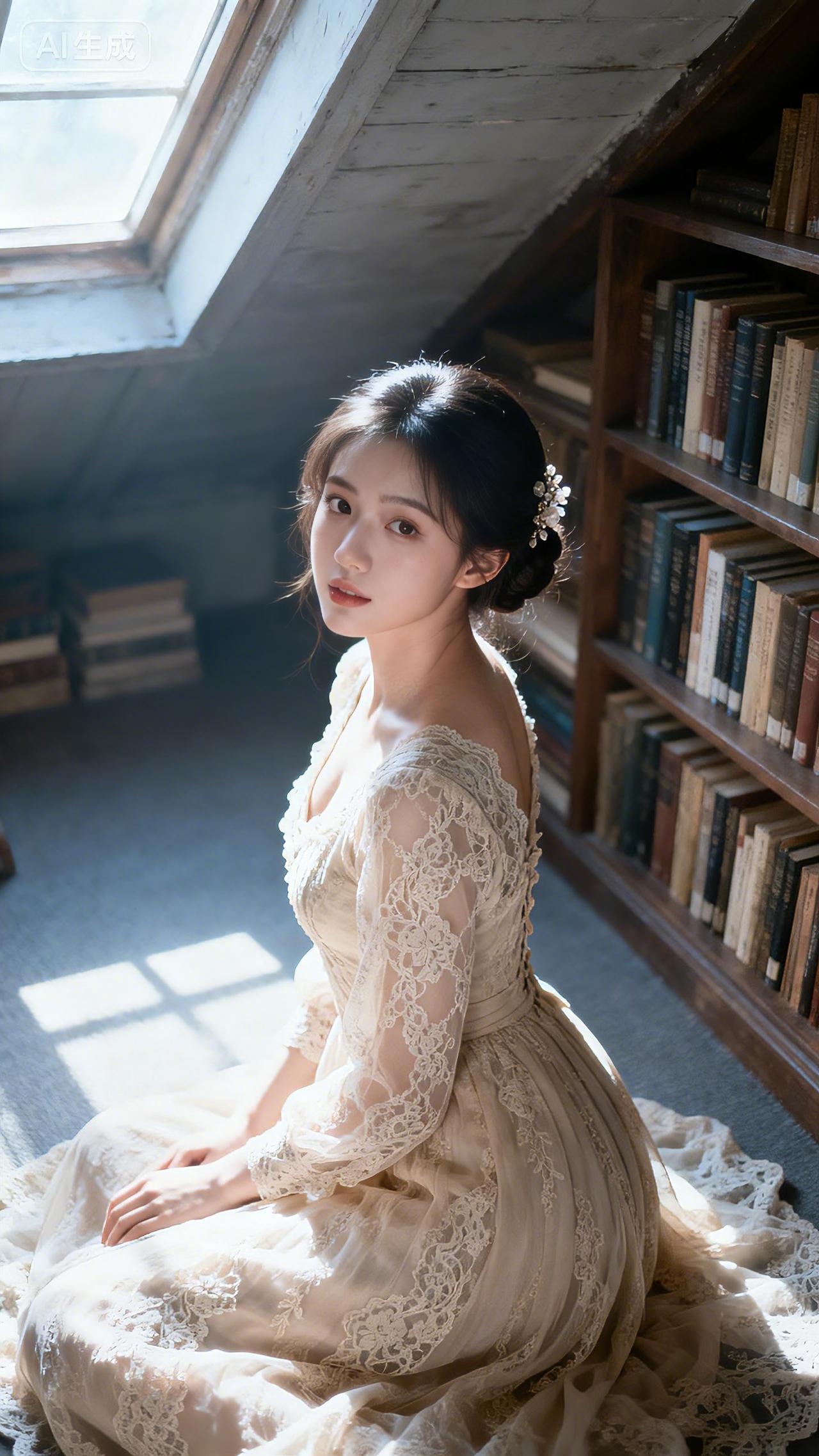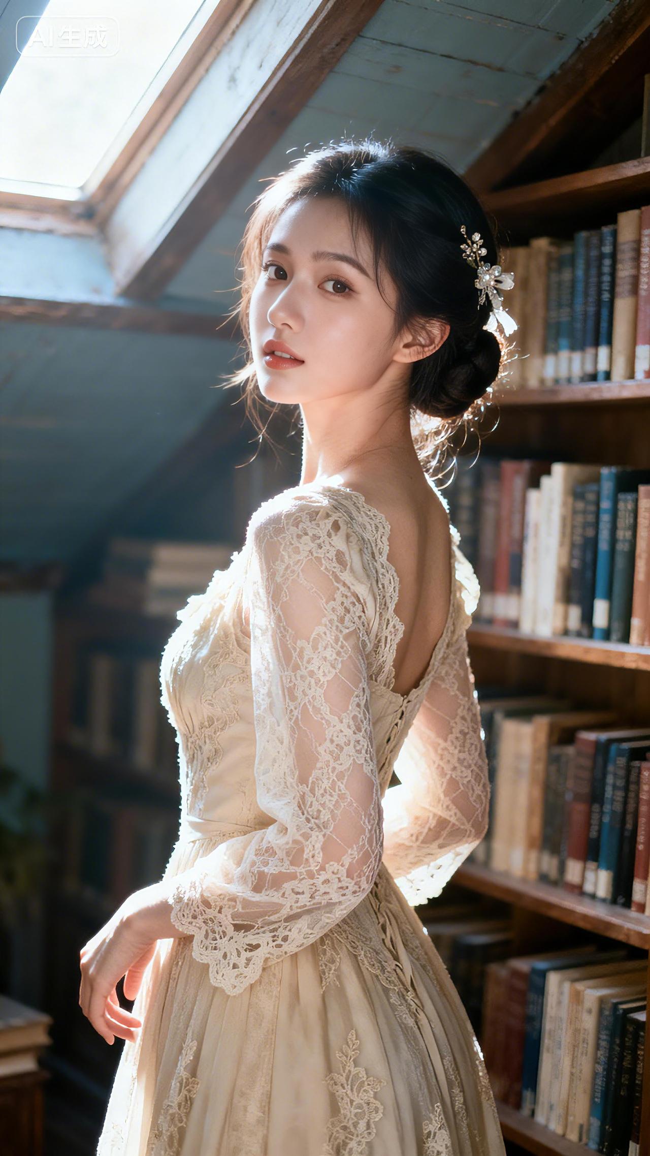 低盘发少女身着蕾丝裙,在静谧阁楼书架边优雅侧身而立。豆包 壁纸