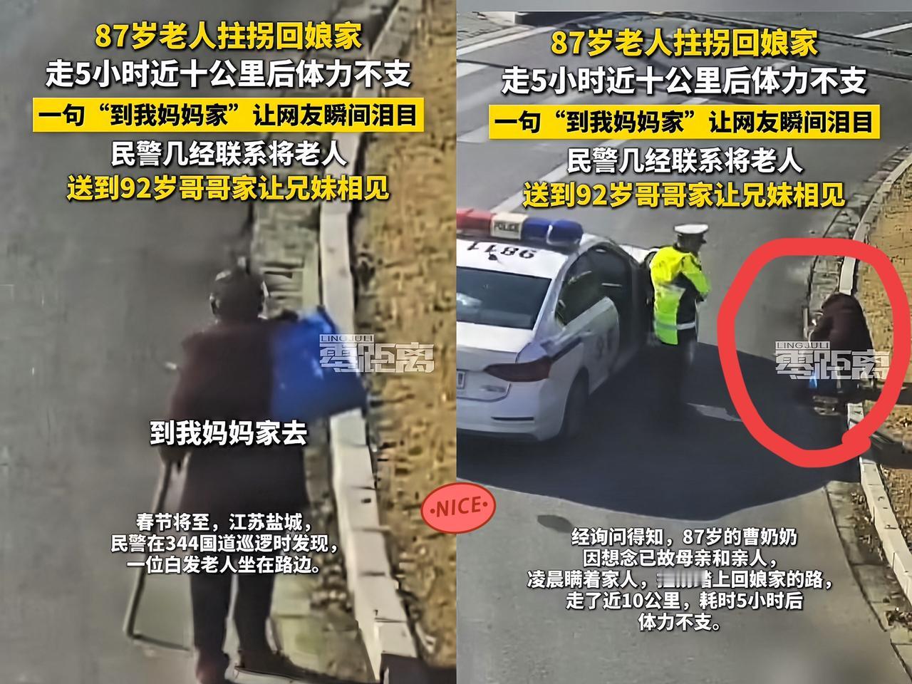 看哭了! 江苏87岁的曹奶奶, 瞒着家人凌晨5点就拄着拐杖出门,一心就为回 娘家见亲人,硬是徒步近10公里。走不动坐在国道边时,一句“到我妈妈家去,我想我妈妈了”,听得人心里酸酸的! 年关将近,儿孙绕膝,可曹奶奶心里还念着娘家,她怕麻烦子女,就自己悄悄上路! 那种对娘家的眷恋,对妈妈的思念,哪怕岁月流逝也未曾淡去,民警遇到后,暖心送她回家,这一幕真的太戳人! 无论多大年纪,娘家永远是心底的温暖港湾,这不仅是曹奶奶的牵挂,也是很多人的共鸣。 大家觉得呢?快分享分享。
