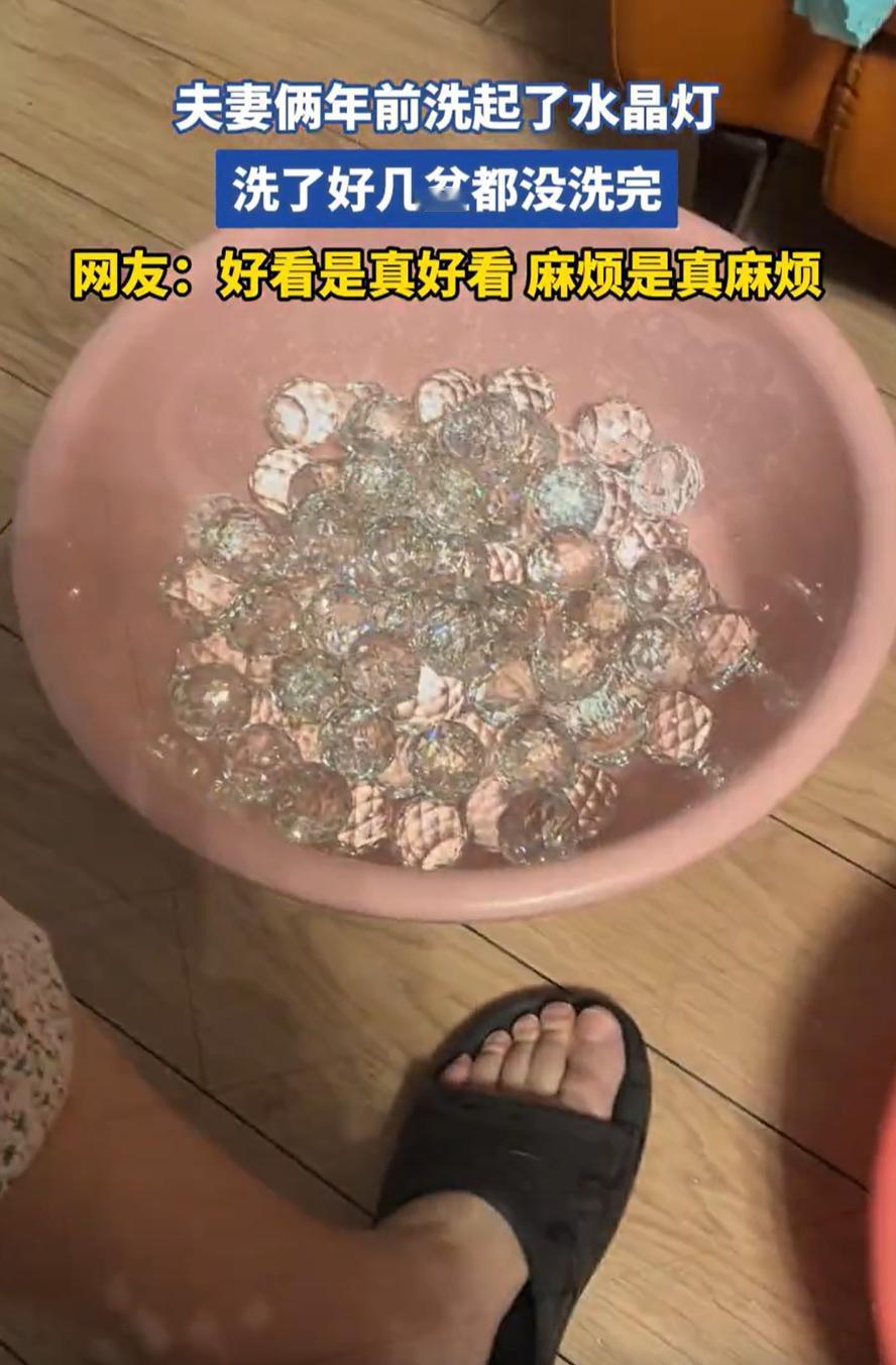 笑不活了!山西,一对夫妻年前在家里大扫除,心血来潮准备把家里的水晶灯清洗一下,可两人刚把灯泡拆下来洗了一会就后悔了,洗了好几盆都没有洗完,网友:这才刚开始,装的事后更麻烦! 年底大扫除,家家户户都忙。夫妻俩收拾屋子时,抬头看到家里那盏多年没擦的水晶灯,一时心血来潮,决定把它彻底清洗一下。说干就干,两人搬来梯子,小心翼翼把灯上的水晶球和灯泡一个一个拆下来。没想到,这一拆,就拆出了一地的“星星” 灯泡和水晶珠堆了满满好几盆,妻子接了一盆水开始洗,丈夫在旁边帮忙。可洗着洗着,两人就感觉不对劲了,这珠子怎么越洗越多?一盆洗完,还有一盆,洗完的亮晶晶,没洗的还堆成小山 夫妻俩从晚饭后开始忙活,左一盆右一盆,洗到晚上十点半,胳膊也酸了,眼睛也花了,还没洗完。妻子一边洗一边苦笑:真不知道当年装修时,为啥非要选个水晶灯 这场景让不少网友感同身受,有网友说:我家有个比这个大10多倍的,好几层的,这个才刚开始,装更难,我告诉你,装回去多了几十个球,可是灯没有可以装的位置了 其实很多人家里都有类似的东西,装修时觉得华丽、气派,日子过久了才发现,打理起来才是真正的考验。水晶灯就是这样,挂着时是装饰,拆下来就成了负担 它像一个美丽的陷阱,用的时候不觉,清理时才知其中麻烦。生活里这样的事其实不少:一时冲动买回来的复杂家具,跟风装修做的华丽背景墙,还有那些不常用却占地方的厨房小电器……当时觉得能提升生活品质,后来才发现,它们都在默默增加你的维护成本 仔细想想,过日子,有时候简单点反而更轻松。不是说不追求美,而是在选择时,多想一想后续的打理和维持。真正的品质生活,未必是看上去最华丽的,而是那种让你住得舒服、打理起来不费神的实在。下次再装修、再买东西时,或许我们会多问自己一句:这东西,我将来愿意花时间去伺候它吗?