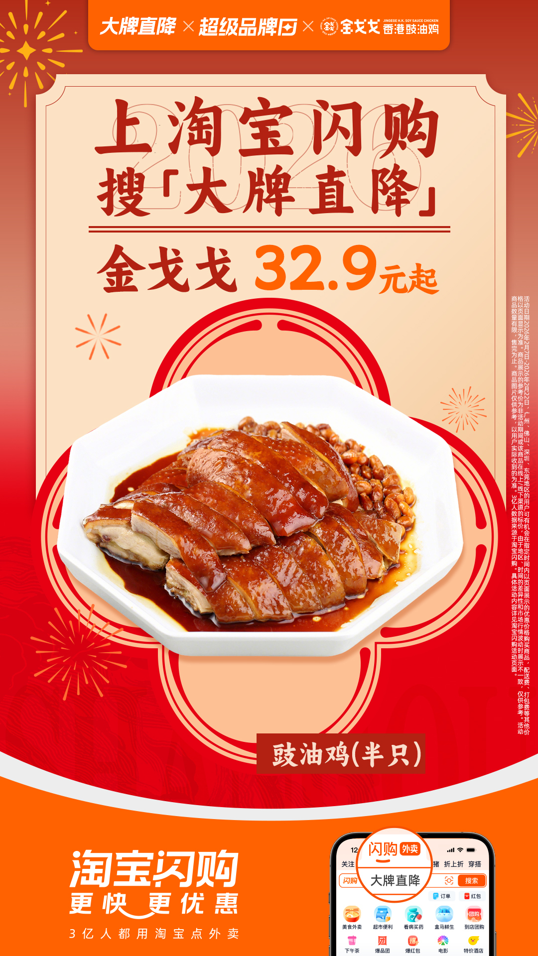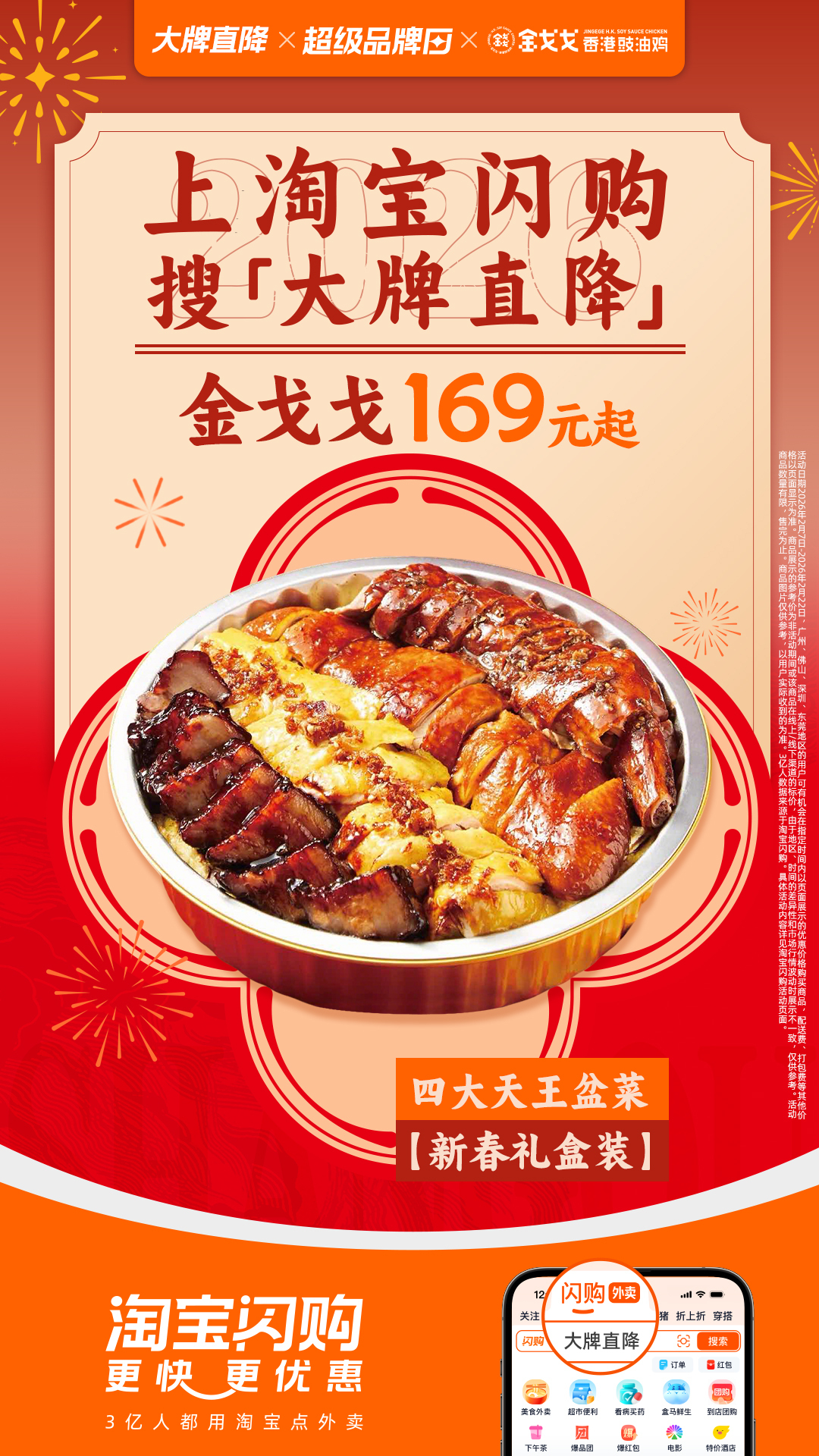 新春将至,又到了广东人吃鸡时刻~没有鸡能走出金戈戈淘宝闪购直降淘宝闪购大牌直降即刻帮你变身“待客高手”!金戈戈四大天王盆菜【新春礼盒装】169元起,一盆撑起全桌年味,超有排面~搭配豉油鸡半只32.9元起,轻松凑齐一桌“硬菜”,这个组合真心划算。淘宝闪购春节照送,大牌直降一口价,唔使烦凑单同煮饭,真正实现“轻松拥有”团圆饭!2月7日-2月20日,淘宝闪购搜索【大牌直降】,金戈戈热销爆款29.9元起,点指定品牌套餐有机会得新年红包。