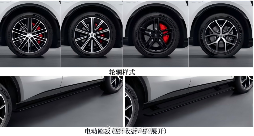 在设计上,纯电动版和增程版车型基本保持一致,但前格栅包围造型有所差异。新车长宽高分别为4960/1985/1736mm,轴距2950mm,定位中大型SUV。提供20英寸和21英寸两种轮圈,轮胎尺寸为255/50R20和265/45R21。配备半隐藏门把手和顶置激光雷达+后向固态激光雷达方案,可选装电动侧踏板。