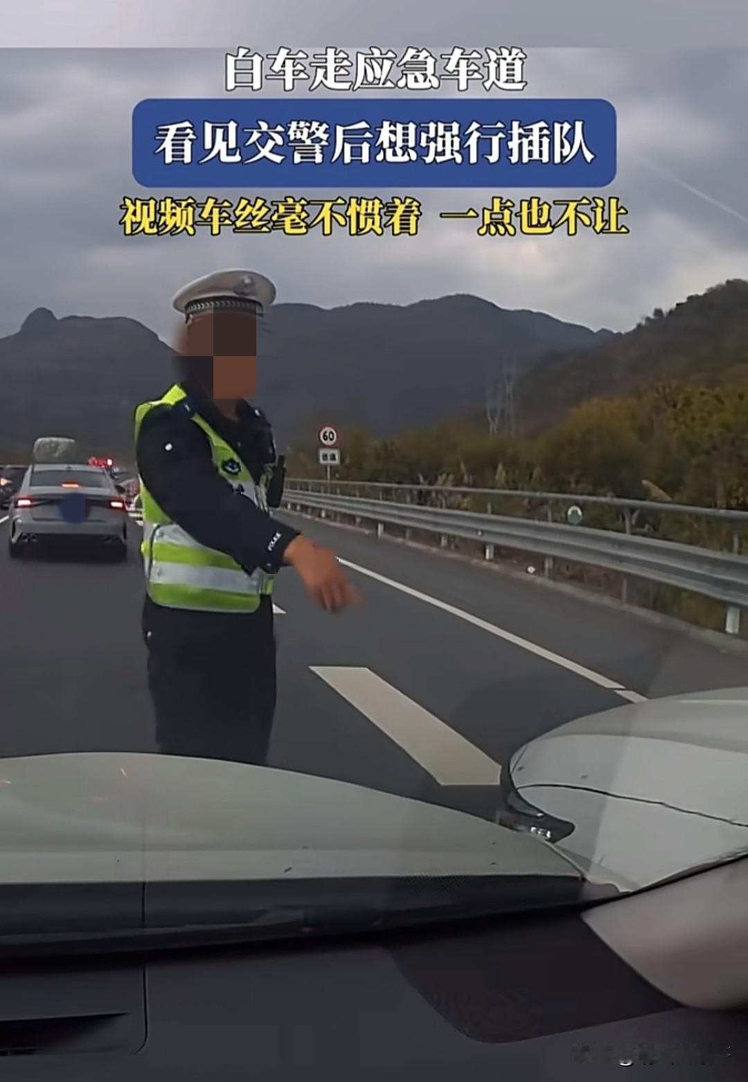 一网友放假回家高速上堵车,旁边一白色轿车在应急车道上行驶,没想到前面不远刚好有交警疏导交通,白色轿车看到后想强行插队,视频车则丝毫不让道,直到交警同志过来抓个正着,这下扣分加罚款是跑不了了,网友们纷纷表示: 干得漂亮,对不守规矩的人就不能让他。有些人就是喜欢不守规则,到最后吃亏的还是自己,礼让他人也得分情况,像这种不守规矩的人,就应该这样让他长点记性。