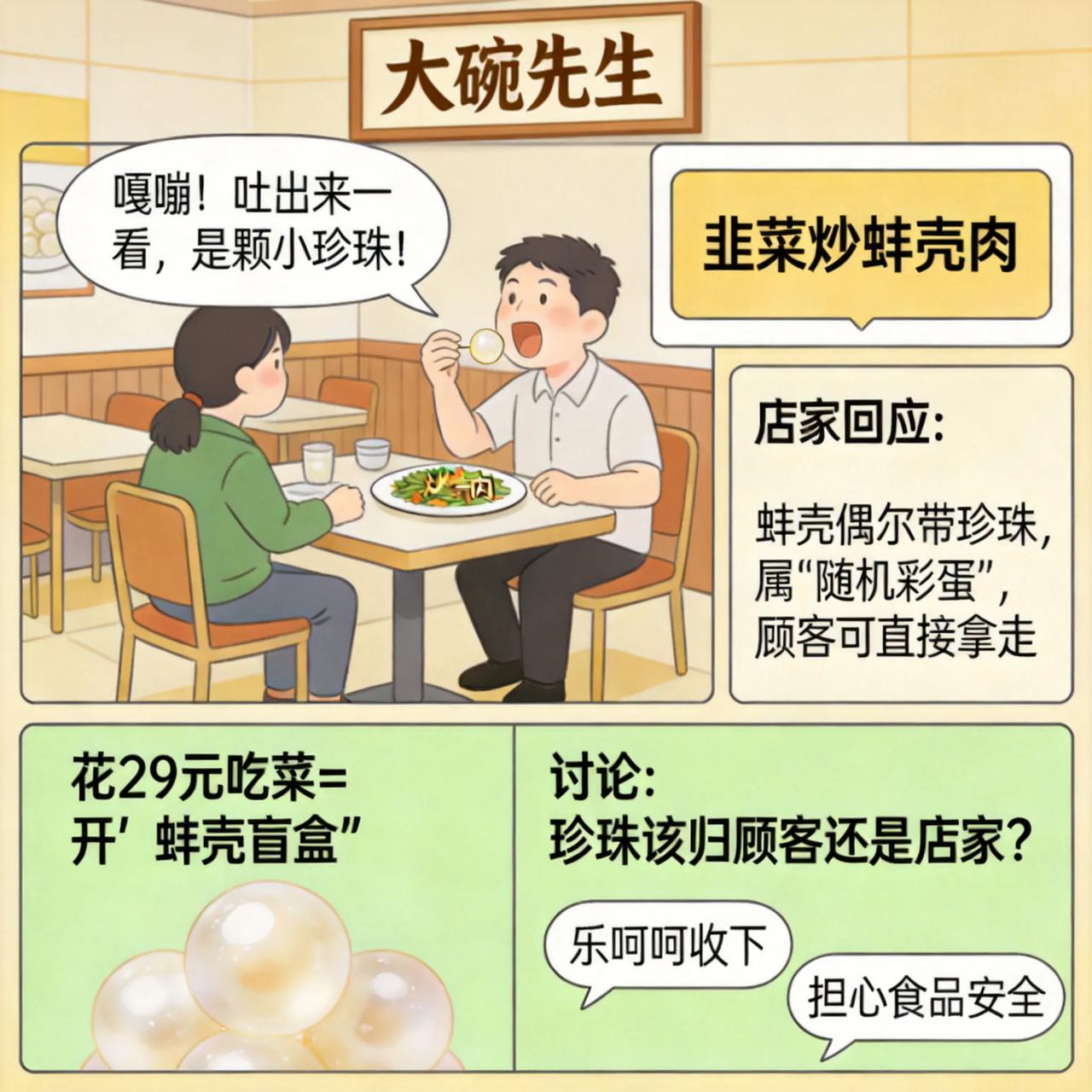 【吃饭吃出“惊喜”,这额外加的“料”该不该归我?】 今天刷到个有意思的事,湖南长沙一位朋友,在大碗先生吃饭,点了盘韭菜炒蚌壳肉。正吃着呢,“嘎嘣”一声,吐出来一看,好家伙,是颗小珍珠! 这事儿店家回应得也实在:蚌壳里偶尔确实会带出珍珠,属于“随机彩蛋”,顾客吃到了直接拿走就行,不用另付钱。听着还挺大方。 想想也挺逗,花29块钱吃个菜,还能开个“蚌壳盲盒”。这珍珠虽小,但好歹是个天然物件儿。要是你,是乐呵呵收下这“天降的小运气”,还是觉得有点哭笑不得,甚至担心食品安全?要是吃出个更大更值钱的,又该怎么算? (如果是你,遇上这种“盘中彩蛋”,会怎么做?这珍珠,你觉得该归顾客还是归店家?评论区聊聊你的看法!)河蚌烹饪方法 韭菜炒河蚌肉 河蚌肉炒韭菜 爆炒蚌壳肉 河蚌韭菜馅 韭菜花炒田螺肉 河蚌肉炒田螺 韭菜炒花蛤肉 蚌肉 河蚌韭菜 河蚌咸肉烧韭菜 蚌壳餐厅 蛤肉炒韭菜 特色蚌壳 河蚌炒粉条