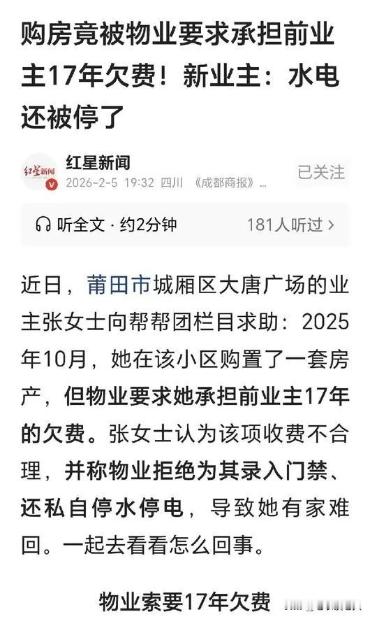 女子买“法拍房”被要求付清前业主17年欠费! 房价贵是众所周知的事情,社会上有一些人,因买不起商品房,想了一个非常好的方法,老是盯着一种买廉价的商品的购物平台,去购买“法拍房”,是非常便宜的,花最少的钱就能买到很满意的商品房。 何为“法拍房”?是通过法庭判决以后,是卖房产来抵债务的一种房产,通常情况下,这种房价都会低于市场价格很多很多。 据媒体2月7日报道,福建莆田有一女子,因买了一套“法拍房”,虽然房价非常便宜,可是万万没有想到,这种法拍房,原来的户主,竟还有欠物业17年的费用,被物业要求该女子即新业主来承担,否则,她没有偿还清原来业主的17年所欠物业费,新业主的水、电、气和门禁卡等入住条件,会受到限制。 该女子通过寻找有关方面维权,经过多方协商以后,女子同意承担前业主的所欠下的水电费用3万元以外,其它所欠费用,由物业通过法律手段向原物主追讨剩余欠费,物业才为她录入小区门禁,恢复供水供电。 由此看来,已经暴露目前物业行业存在的许许多多的不良问题,物业收了物业主的费用,就要为物业主提供物业服务,是一种必然的应尽的业务,是有法可依的。 所以,物业必须要为物业主提供必要的与物业相关的服务,履行物业的职责所在。 目前,物业服务的提供与费用追缴,都是有法可依,有规章制度可循的,物业方面应该遵循法律规定与合同约定,依法依规举持公道办事,只有严格规范管理流程,依法所行使的职责事务,物业才能够真正地保障每一个业主的合法权益,同时做好了物业本职工作,才能够促进社区和谐与安定,为物业主谋求真正的福利。 话回过头来说,贪求讲便宜,少花钱就能够住好房子,必然会有很多陷阱等待着你来跳,从客观事理上来看也是必然存在的,也是顺理成章的事情。这一点必须在买便宜房子之前就要想清楚的,就要做好思想准备,想占小便宜,必然就要吃大亏,也是情理之中的事情。 以上是本人观点,如有不妥,请大家在留言区去,留下你宝贵的意见,并积极参与评论,特邀请大家关注。