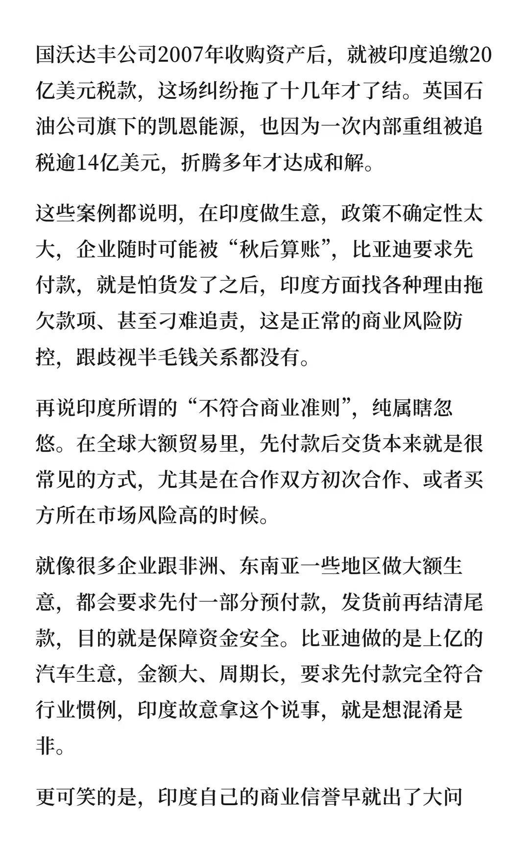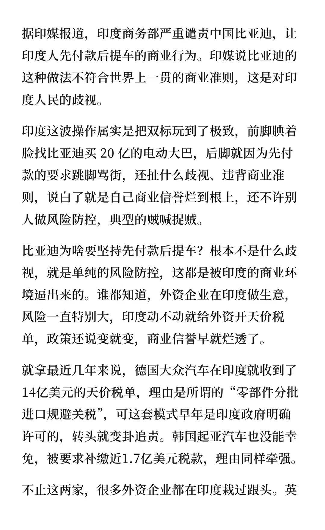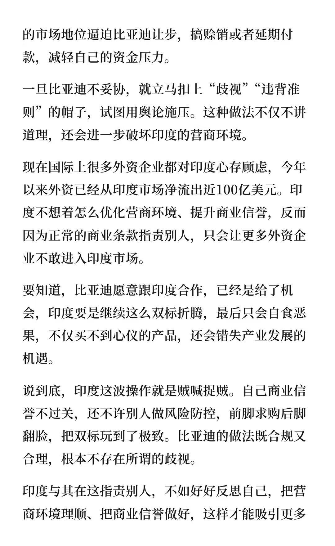 据印媒报道,印度商务部严重谴责中国比亚迪 比亚迪要求先付款后提车是出于风险防控,符合行业惯例。印度指责为歧视,实则双标,自身商业环境不稳,政策不确定性高。比亚迪的举措合理,但印度却借此指责,破坏了营商环境,错失发展机会。比亚迪 国际新闻 贸易 印度 国际 德国 英国 美国 热点新闻事件