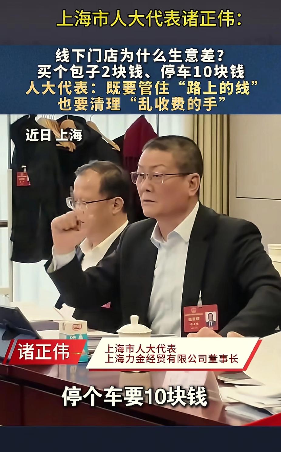 总算有人愿意为停车费发声了! 上海市人大代表诸正伟为实体商户发声,直言路边不合理的停车费正拖垮实体生意,引发大众强烈共鸣。 他提出,要规范道路上的各类划线规划,首要就是管住乱收费的手,直击当下路边停车收费的乱象。 诸正伟质疑,马路边随处可见的收费停车位,其设置是否具备合法依据,这般乱收费的行为与巧取豪夺的买路财并无二致。 代表敢为百姓说话,戳中实体经营的痛点,这番直言不讳的发声,赢得了老百姓的一致点赞和全力支持。