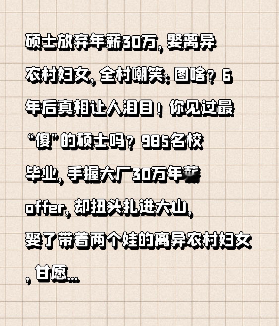 硕士放弃年薪30万,娶离异农村妇女,全村嘲笑:图啥?6年后真相让人泪目! 你见过最“傻”的硕士吗?985名校毕业,手握大厂30万年薪offer,却扭头扎进大山,娶了带着两个娃的离异农村妇女,甘愿当起“孩子王”。全村人戳着脊梁骨骂他糊涂,连亲妈都气得半年没理他,他却笑着说:“这才是我想要的生活。” 2018年,28岁的李明涛从名牌大学硕士毕业,本该留在一线城市发光发热,一次公益支教却彻底改变了他的人生。在贵州深山的小学里,他看到了太多令人心疼的画面:孩子们背着破旧书包走两小时山路上学,放学回家只能对着空荡荡的屋子,父母常年在外打工,留守儿童们连顿热饭都难吃上。而村里的单亲妈妈王秀莲,一个人拉扯着两个孩子,白天种地,晚上还要给孩子们辅导作业,累得直不起腰,却总把最好的留给孩子。 李明涛动了心,他想留下来帮这些孩子。可当他提出要娶王秀莲、一起守护留守儿童时,反对声铺天盖地而来。“高材生娶二婚村妇,真是白读了书!”“肯定是图人家房子地,不然脑子进水了?”就连支教团队的同事都劝他:“你有更好的前程,没必要把自己困在这里。” 转折点发生在2020年的一个雨夜。村里10岁的留守儿童小雨发高烧,山路泥泞无法下山,王秀莲急得直哭。李明涛背着小雨,打着手电筒在暴雨中走了3小时,终于赶到乡镇医院。看着病床上小雨拉着他的手说“李老师,你好像爸爸”,李明涛更加坚定了自己的选择。他用自己的积蓄翻修了村里的旧校舍,建起了“留守儿童之家”,教孩子们读书写字、做手工、学英语,王秀莲则负责孩子们的饮食起居,把每个孩子都当成亲生的一样疼。 如今6年过去,曾经嘲笑他的人都闭了嘴。村里的留守儿童从没人管变成了有学上、有人疼,先后有12个孩子考上了县城重点中学,其中3个还拿到了奖学金。李明涛依然穿着朴素的衣服,住着简单的房子,却收获了最珍贵的幸福。他说:“年薪30万固然诱人,但看着孩子们眼里的光,这种满足感是金钱买不到的。” 不是所有的伟大都惊天动地,有时候,把平凡的选择坚持到底,就是最动人的传奇。李明涛放弃了世俗意义上的成功,却用爱和坚守,为留守儿童撑起了一片天。这个世界上,总有人在默默付出,用自己的微光温暖他人。如果你也被这份善良打动,点赞转发,让更多人看到这份平凡中的伟大,也让正能量传递下去!