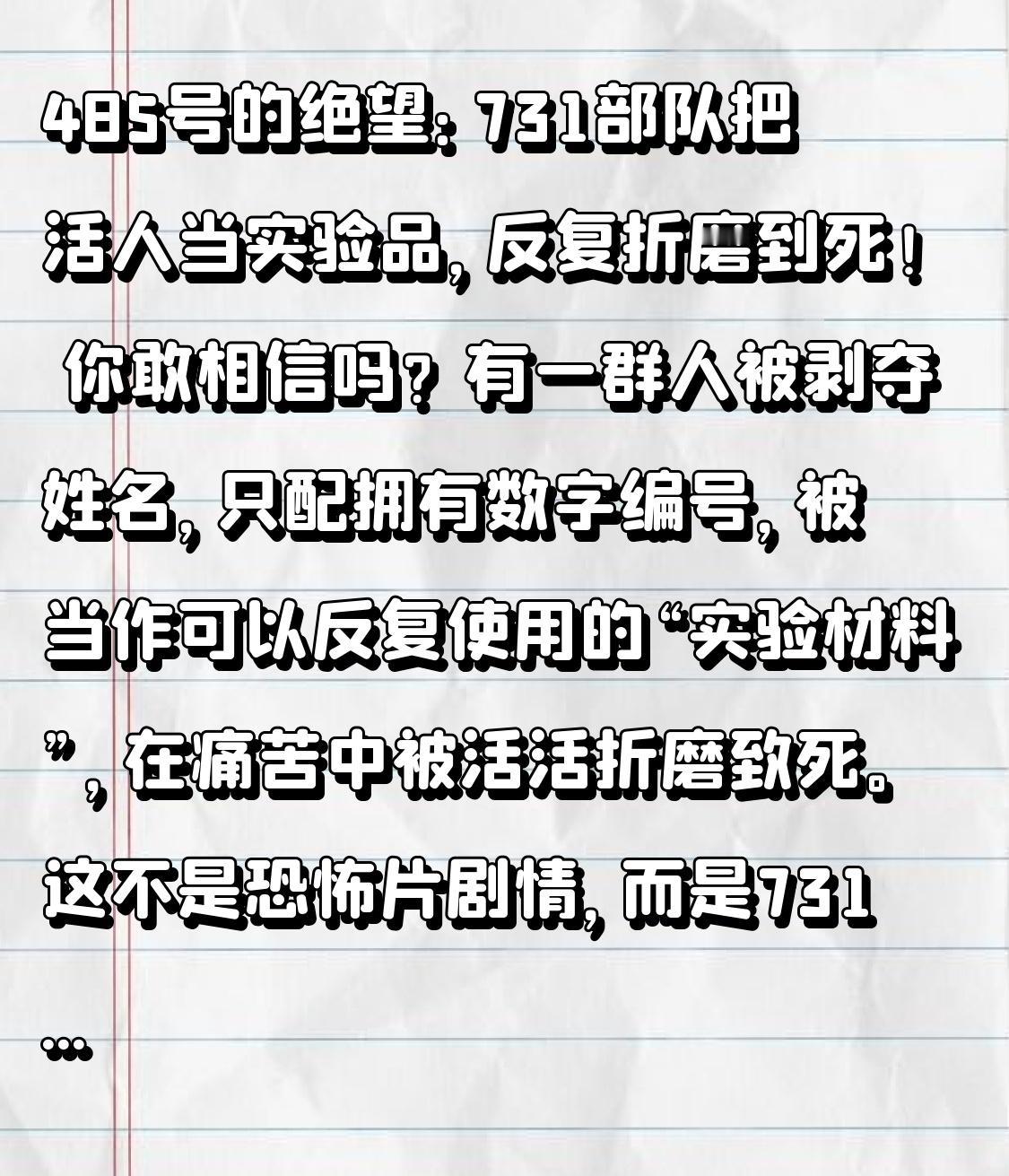 485号的绝望:731部队把活人当实验品,反复折磨到死! 你敢相信吗?有一群人被剥夺姓名,只配拥有数字编号,被当作可以反复使用的“实验材料”,在痛苦中被活活折磨致死。这不是恐怖片剧情,而是731部队留给人类的真实噩梦。 2026年刚解密的42页日军档案,撕开了最黑暗的一页。1940年9月,20名无辜者被关进哈尔滨平房区的地狱,编号485的他,经历了常人无法想象的炼狱。日军先强迫他灌下300毫升高浓度芥子气毒液,眼部被滴入剧毒,在他呕吐不止、皮肤溃烂时,没有任何救治,反而被拖去进行下一轮接种实验。档案里冰冷记录着“12小时起泡,24小时呼吸障碍,48小时症状峰值”,却只字不提受害者的惨叫与挣扎。 更让人齿冷的是,这些所谓的“治疗”全是骗局。日军给受试者涂抹氧化锌软膏,不是出于人道,而是测试这些药物能否给日军士兵使用。他们一边记录受害者的死亡过程,一边优化毒剂配方,把一条条生命当成数据样本。在安达野外实验场,16名受试者被绑在柱子上,日军发射4800发毒气弹,看着他们在菌液雨中撕心裂肺,却在望远镜后冷静记录。 然而最讽刺的转折来了:日本政府早在1964年就拿到了这份罪证,却对外宣称“没有资料”。直到2025年,俄罗斯转交的解密档案和731老兵的临终证言,才让这段被掩盖的历史重见天日。当年的司机越定男供述,战败前他们开车轧死逃跑的受试者,烧掉80多具尸体扔进松花江;少年兵筱冢良雄回忆,活人解剖时“血还在喷,内脏还是热的”。 这些不是遥远的历史,而是真实发生过的反人类暴行。当日本右翼还在否认历史时,3010页档案、312张照片早已形成铁证闭环。我们铭记这些苦难,不是为了延续仇恨,而是因为忘记历史就意味着背叛。 今天的我们,生在和平年代,更要记住485号、记住那些没有名字的受害者。他们用生命告诉我们:和平从来不是理所当然,唯有铭记伤痛,才能守护正义。如果你也觉得不该忘记这段历史,点赞转发,让更多人知道731部队的滔天罪行,让和平之光照亮每一个黑暗的角落!