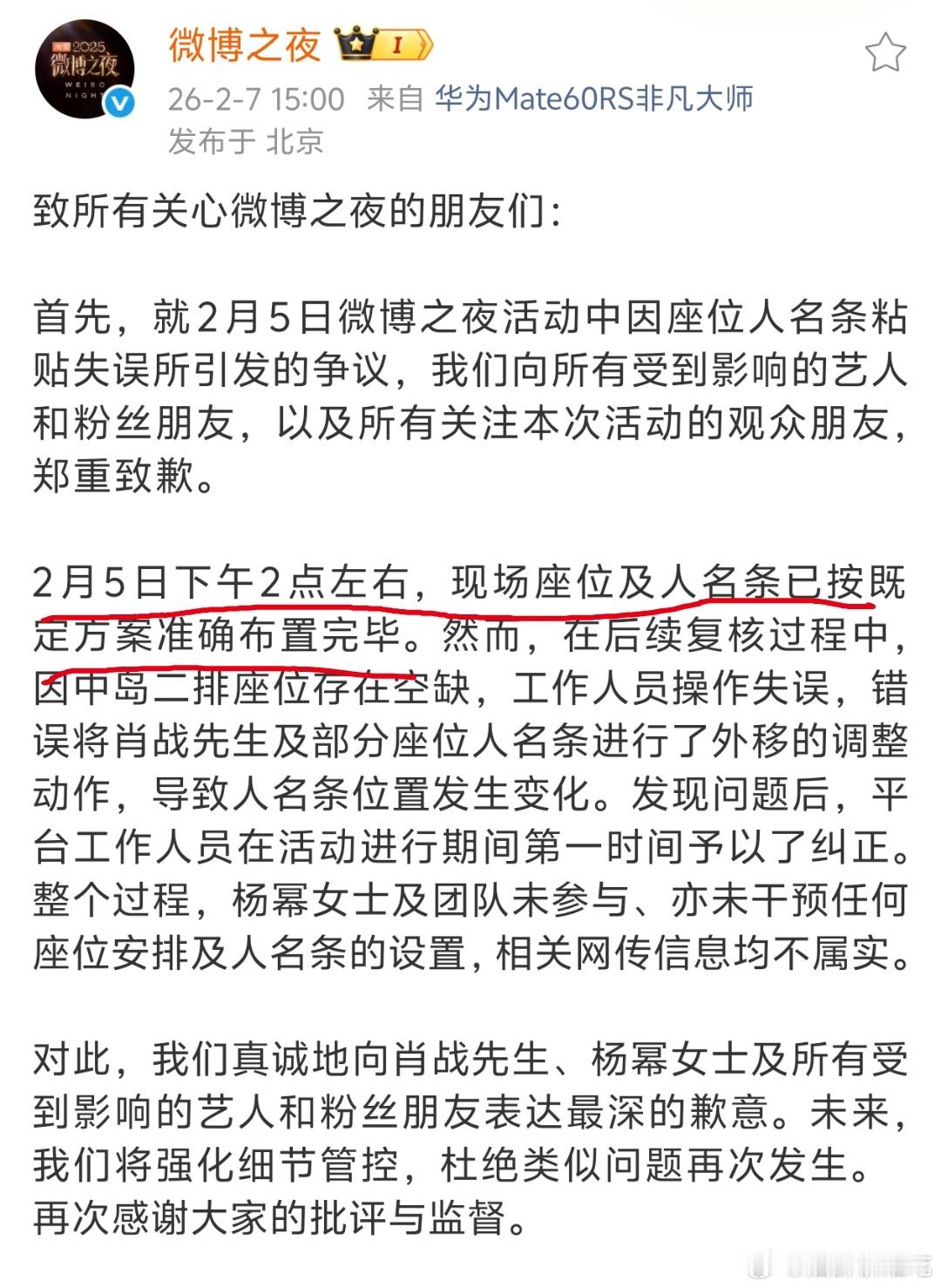 说空位是非常可笑的说法,因为他声明中明确说了2点的位置是【既定方案】安排的位置,我不信微博之夜明星座什么位置负责人不跟明星团队商量,特别是涉及中心位的艺人,怎么可能在贴好后由工作人员随便移动!再次强调那天没有未官宣艺人空降第二排
