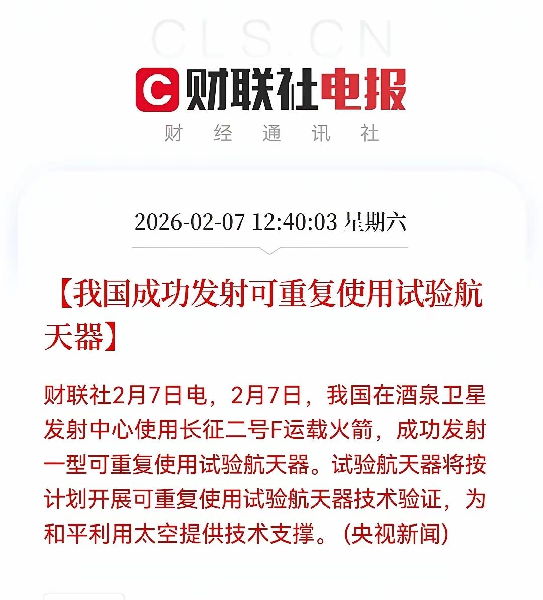 🔥商业航天再迎重磅催化!可重复使用航天器成功发射,板块行情或迎风口—— 2月7日,我国在酒泉卫星发射中心使用长征二号F运载火箭,成功发射一型可重复使用试验航天器,这一里程碑式突破,无疑为商业航天赛道注入了强劲动力。 从技术维度看,可重复使用航天器是降低航天发射成本、提升商业航天经济性的核心抓手,此次成功发射标志着我国在该领域的技术验证取得关键进展,有望加速商业化落地进程。从产业逻辑看,随着技术成熟度提升,商业航天的应用场景将持续拓展,卫星互联网、空间探测、太空旅游等细分领域的市场空间有望逐步打开。 从市场情绪来看,近期航天领域的密集利好,有望进一步提升板块的关注度和资金偏好。不过需要注意的是,板块行情的演绎仍受技术突破节奏、政策落地力度、全球航天产业竞争格局等多重因素影响,短期波动风险仍存。 ⚠️免责声明:本文仅为行业信息解读,不构成任何投资建议。投资者据此操作,风险自担。
