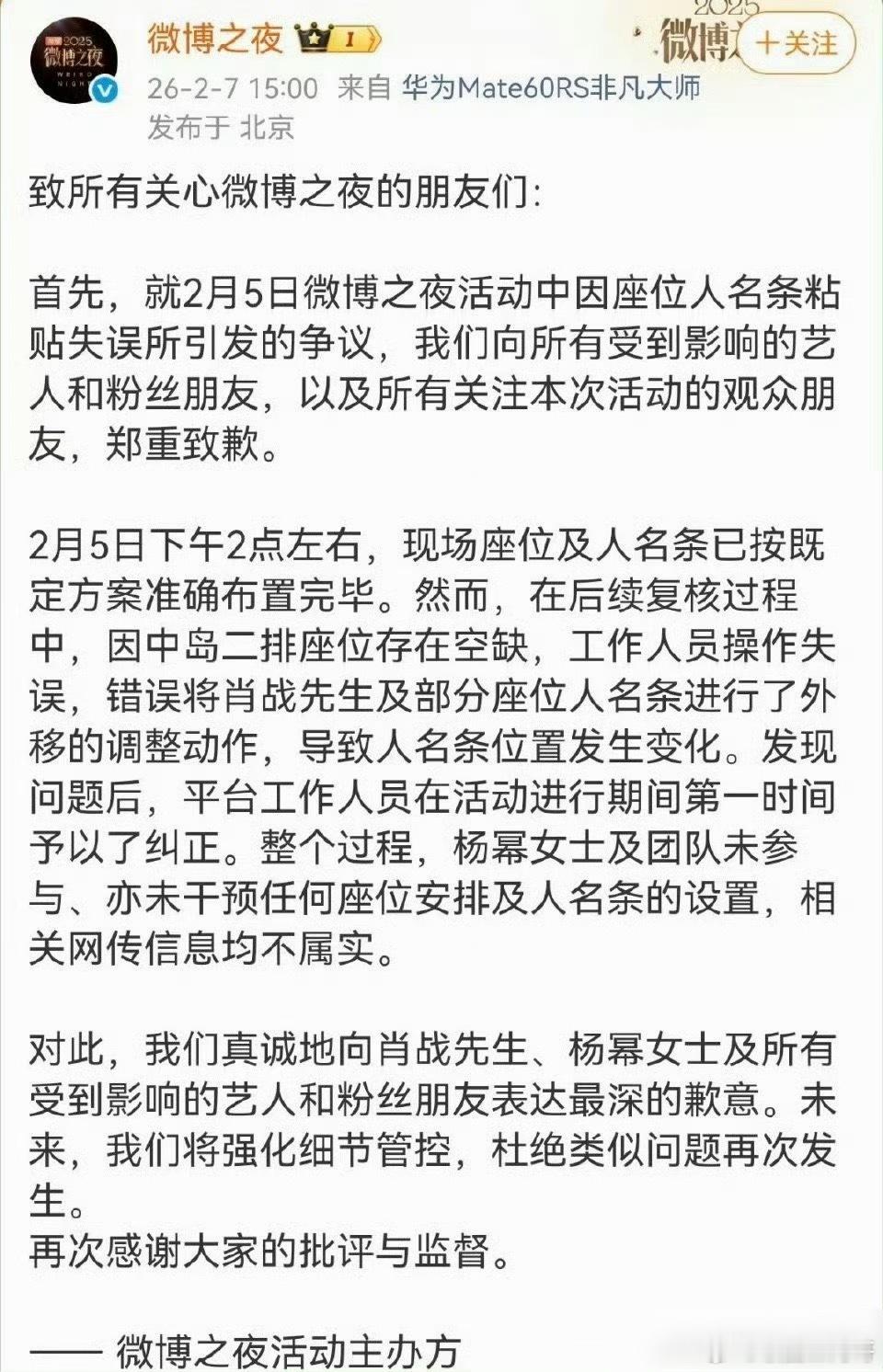 微博之夜声明杨幂肖战内场座位事件微博之夜再发声明
