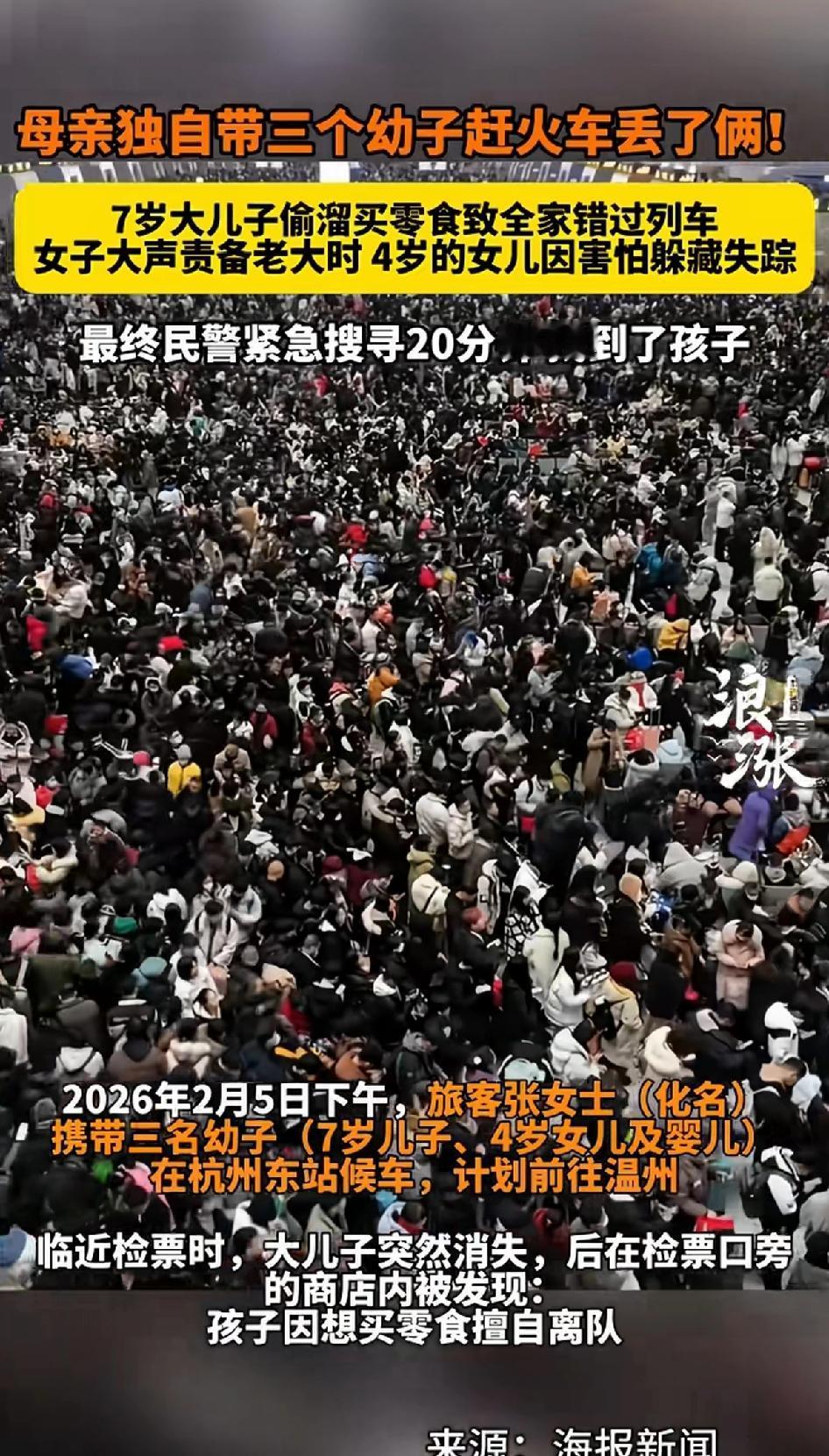 母亲独自带三个幼子去赶火车丢了,独自带娃赶火车本就艰难,可有的妈妈还得独自带三个幼子,这难度直接拉满。 2月5日杭州东站,张女士带三个孩子和大量行李候车,临近检票大孩子不见了,原来是7岁的老大偷溜买零食导致全家错过列车, 一番找寻才在商店找到,结果错过列车。 张女士又气又急,更糟的是这时老二也不见了。原来是女子大声责备老大时四岁的老二因害怕妈妈责备,的躲帮起来。 最终民警紧急搜索20多分钟,找到孩子。 一个女人带了三个幼子,真是太有精力了,平时带孩子费心费力。这还在高铁站人流量大的地方,不得不说这个妈妈真是太厉害了。 刚看到这条新闻的时候正被人催生二胎,一个孩子我带着都费劲,人家带着三个幼子去坐高铁。这心理真够强大的。小心眼子也要不了二胎,同时也彻底打消我要二胎的想法。