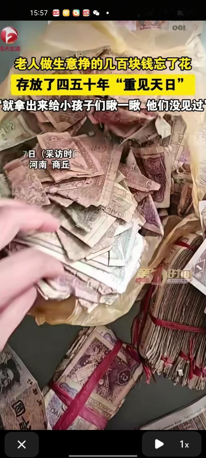 2月6日,商丘市柘城县。杨女士分享一段视频,老人做生意赚了几百块却忘了花,存放了四五十件,如今这些钱“重见天日”。这些钱没想着处理,就存放起来了。因为不太值钱,就拿出来给小孩子瞧一瞧,他们没见过。