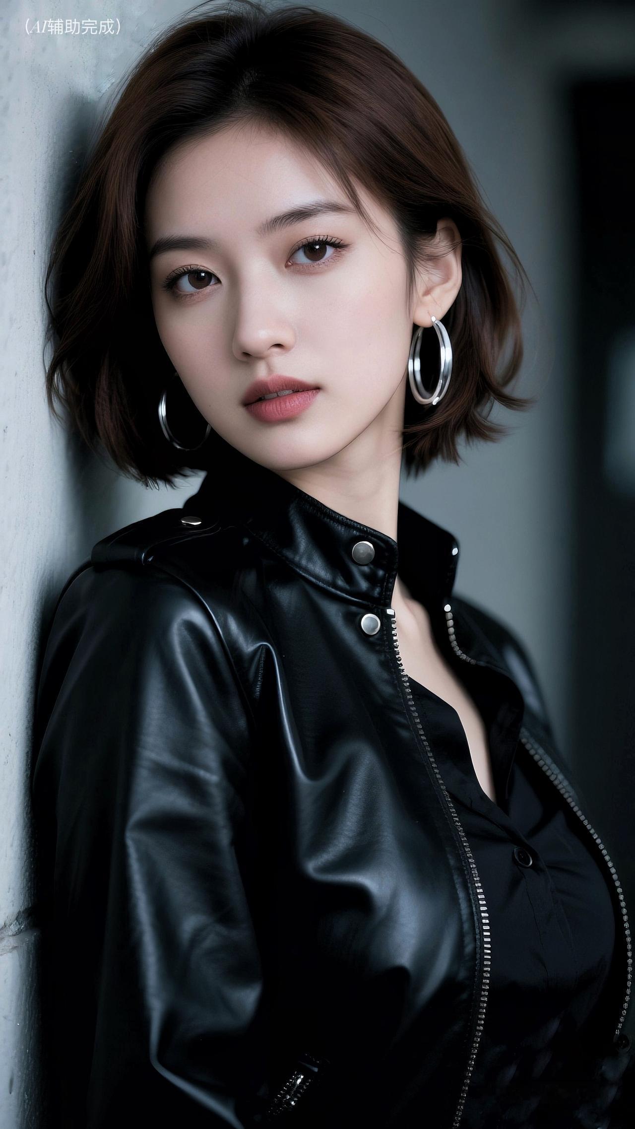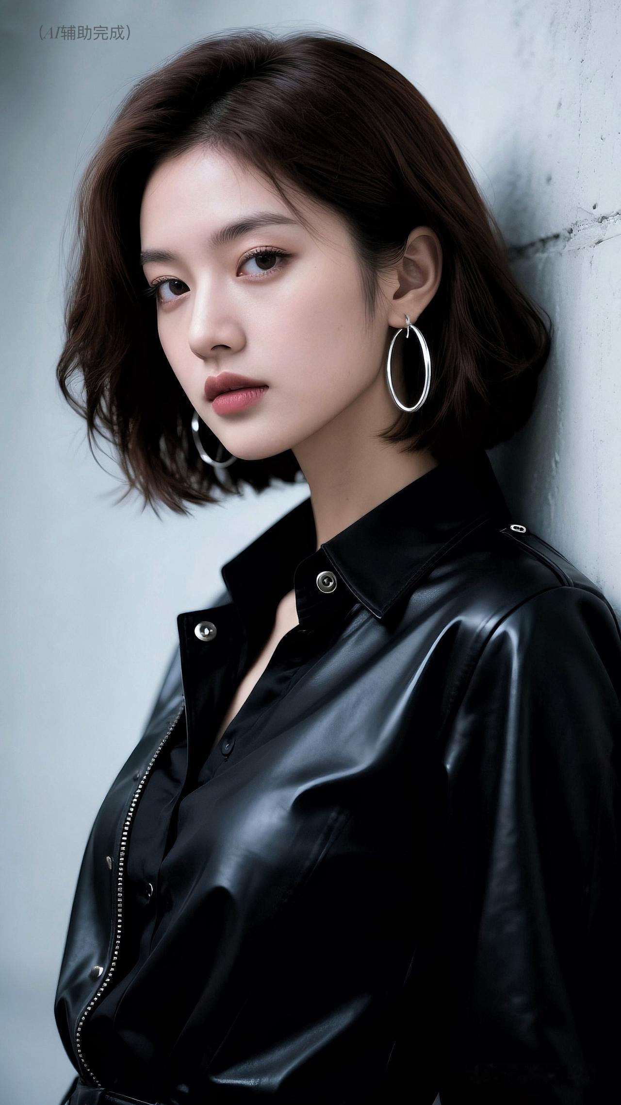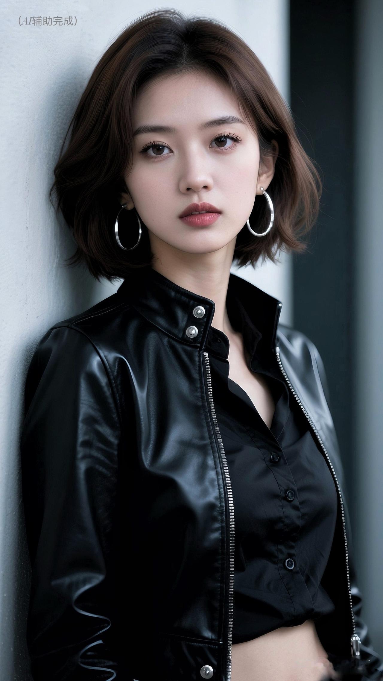 棕褐短发微卷垂落,大银环耳饰闪亮。黑皮衣领口金属扣点睛,露锁骨添酷感。眸沉静藏星,红唇提气场。侧倚灰白墙,光影交织高级神秘境。冷艳优雅时尚美人,一眼沦陷!