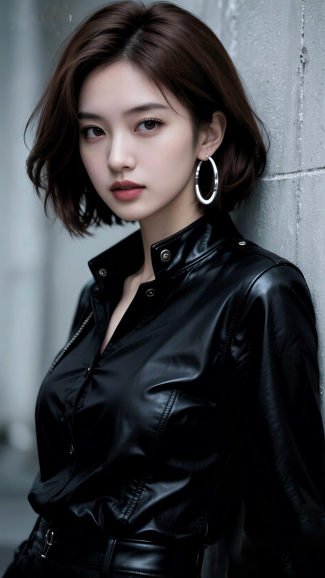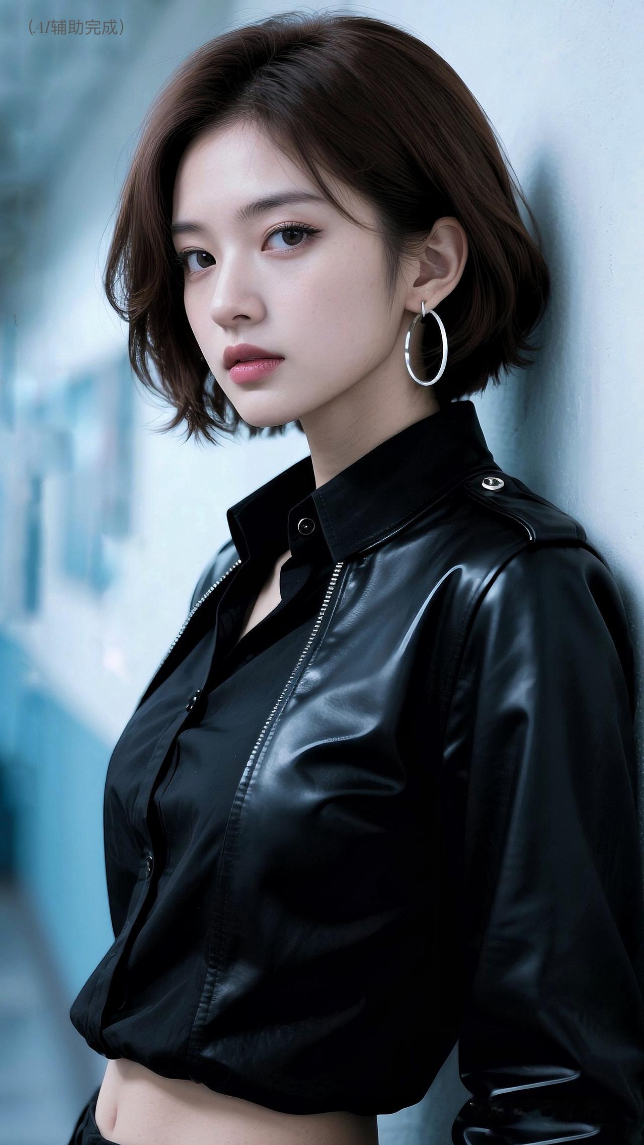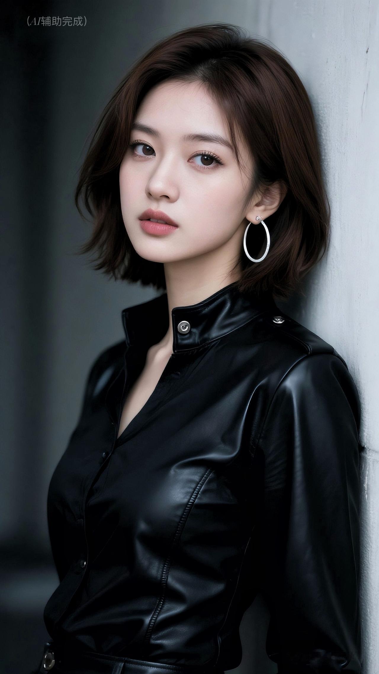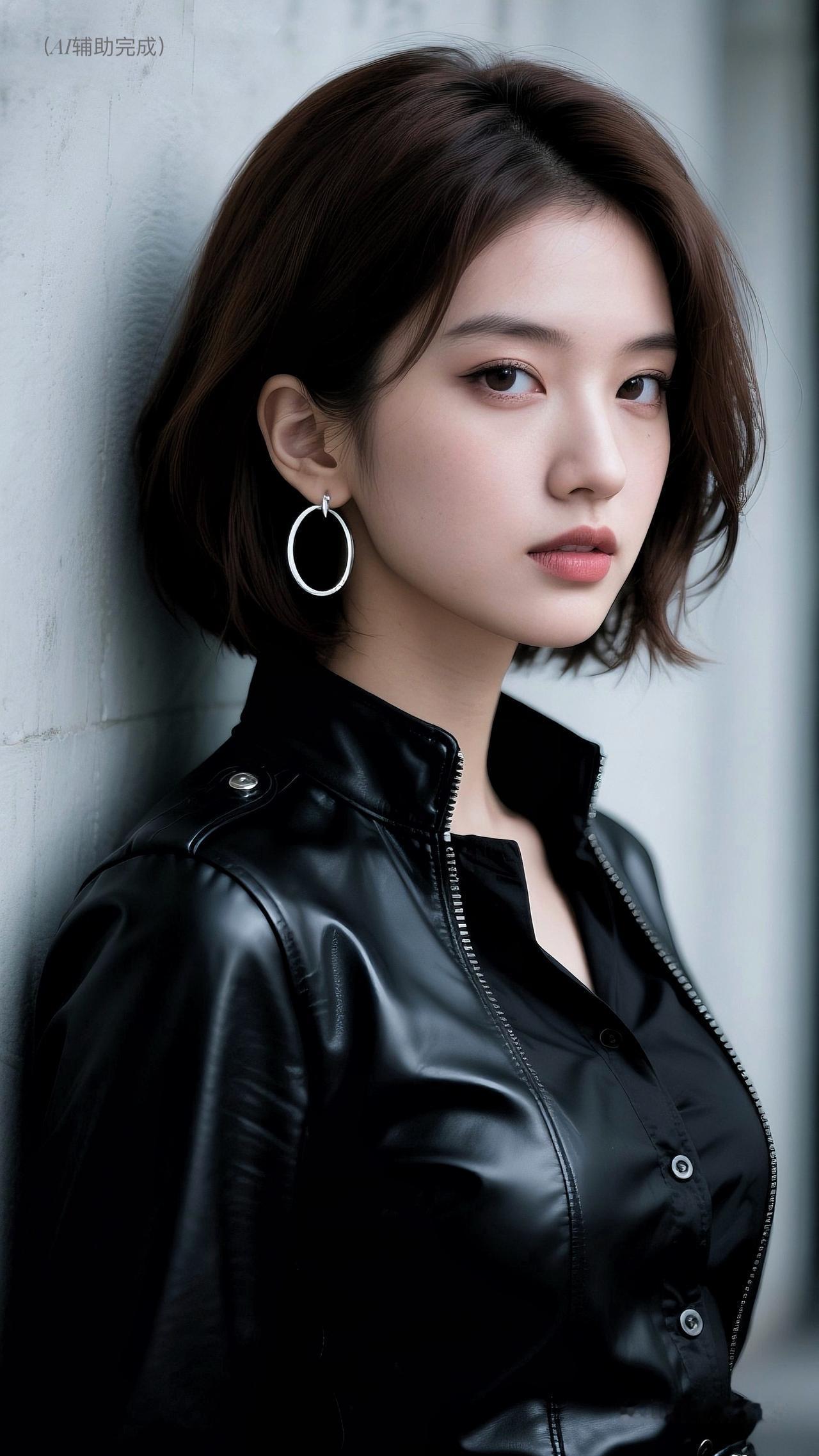 棕褐短发微卷垂落,大银环耳饰闪亮。黑皮衣领口金属扣点睛,露锁骨添酷感。眸沉静藏星,红唇提气场。侧倚灰白墙,光影交织高级神秘境。冷艳优雅时尚美人,一眼沦陷!
