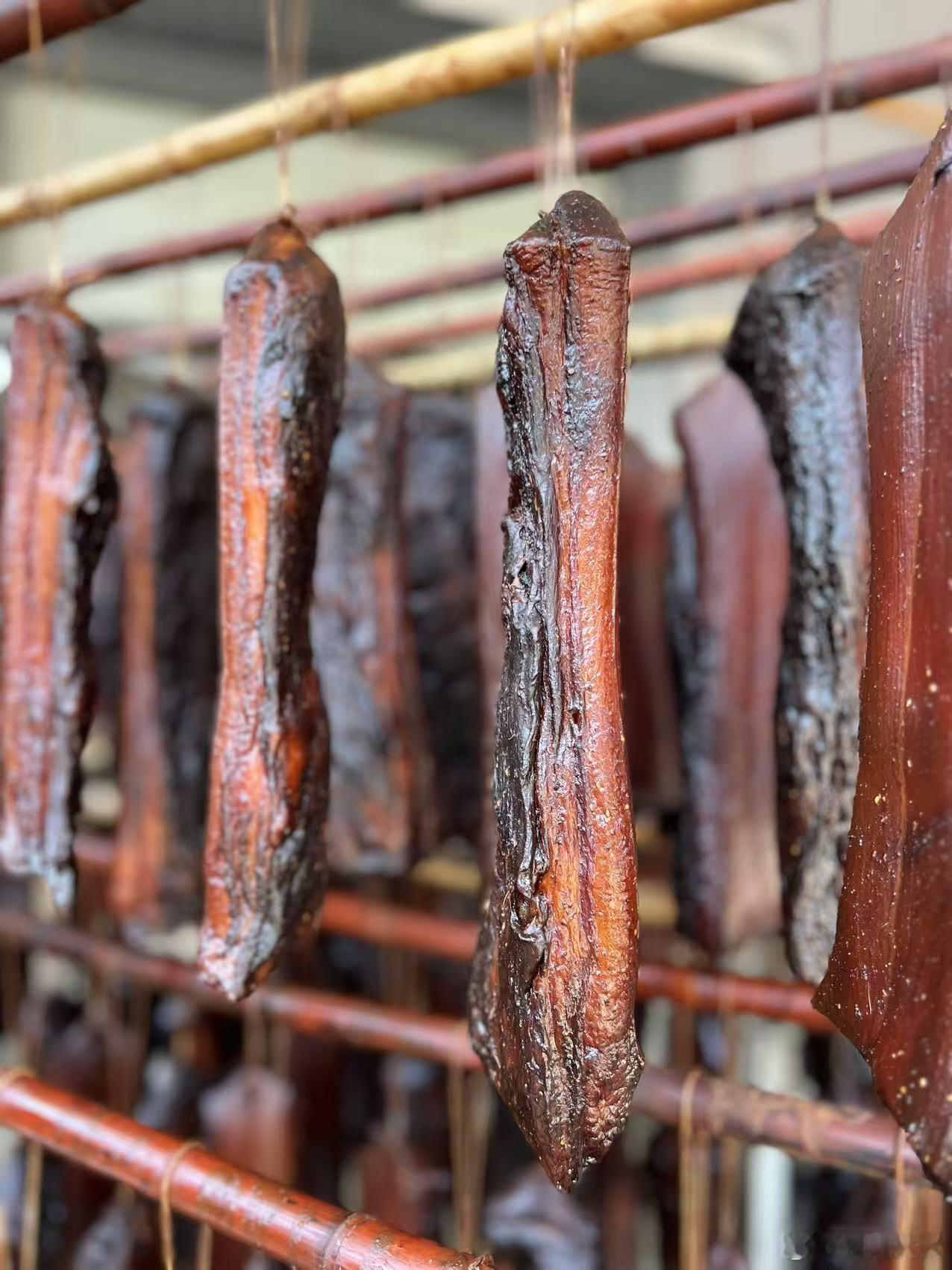 大家总喜欢将酱肉与腊肉做对比,酱肉重点在于酱,也就是猪肉用以甜面酱为主的腌料腌制以后晾干而成,不烟熏。而腊肉呢,也就是腊干制成的肉了,主要是猪肉经过腌制以后再烟熏晾干而成。