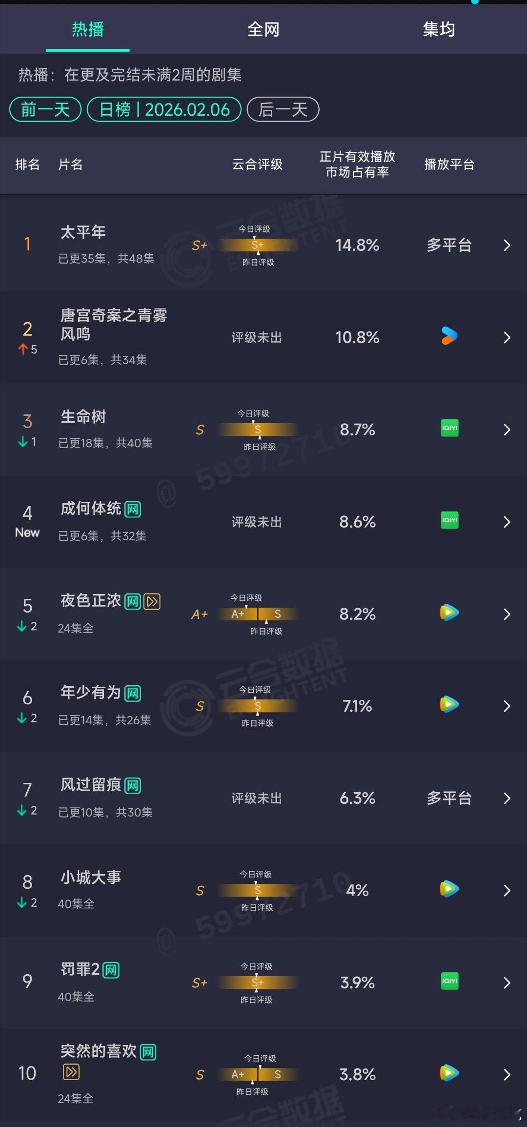 2.06云合:唐宫奇案次日10.8%生命树8.7%成何体统首日8.6%,中午开播。