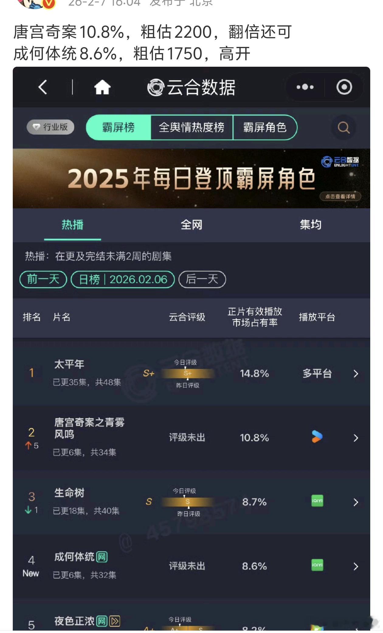 成何体统首日云合8.6%1750w高开!!
