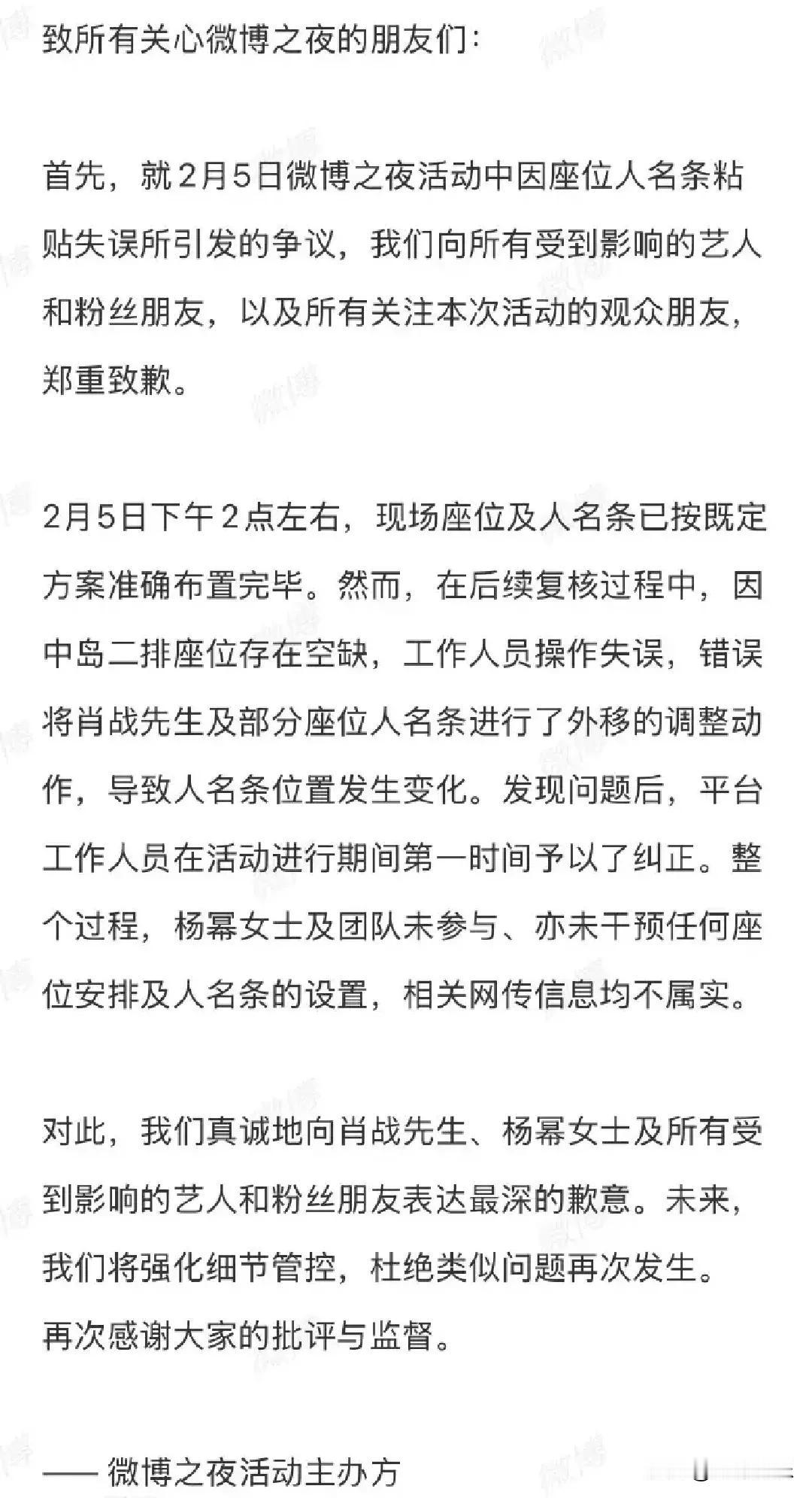微博之夜这场大戏比颁奖还好看!就因为工作人员“手滑”贴错人名条,差点让杨幂背上“抢C位”的锅。人家工作室直接喊话:“很突然,很震惊,很无奈,给个说法吧!” 主办方只好两次道歉,说都是自己的错。 这件事好笑又无奈。一个座位贴纸,能让全网吵翻天。大家盯着谁坐哪,好像在看幼儿园排排坐吃果果。但真正的“C位”,不该是角色和作品吗?肖战、杨幂拿了KING和QUEEN,荣誉在手,可比沙发上的几厘米位置重要多了。 希望下次热搜,多聊点作品,少吵点座位吧。