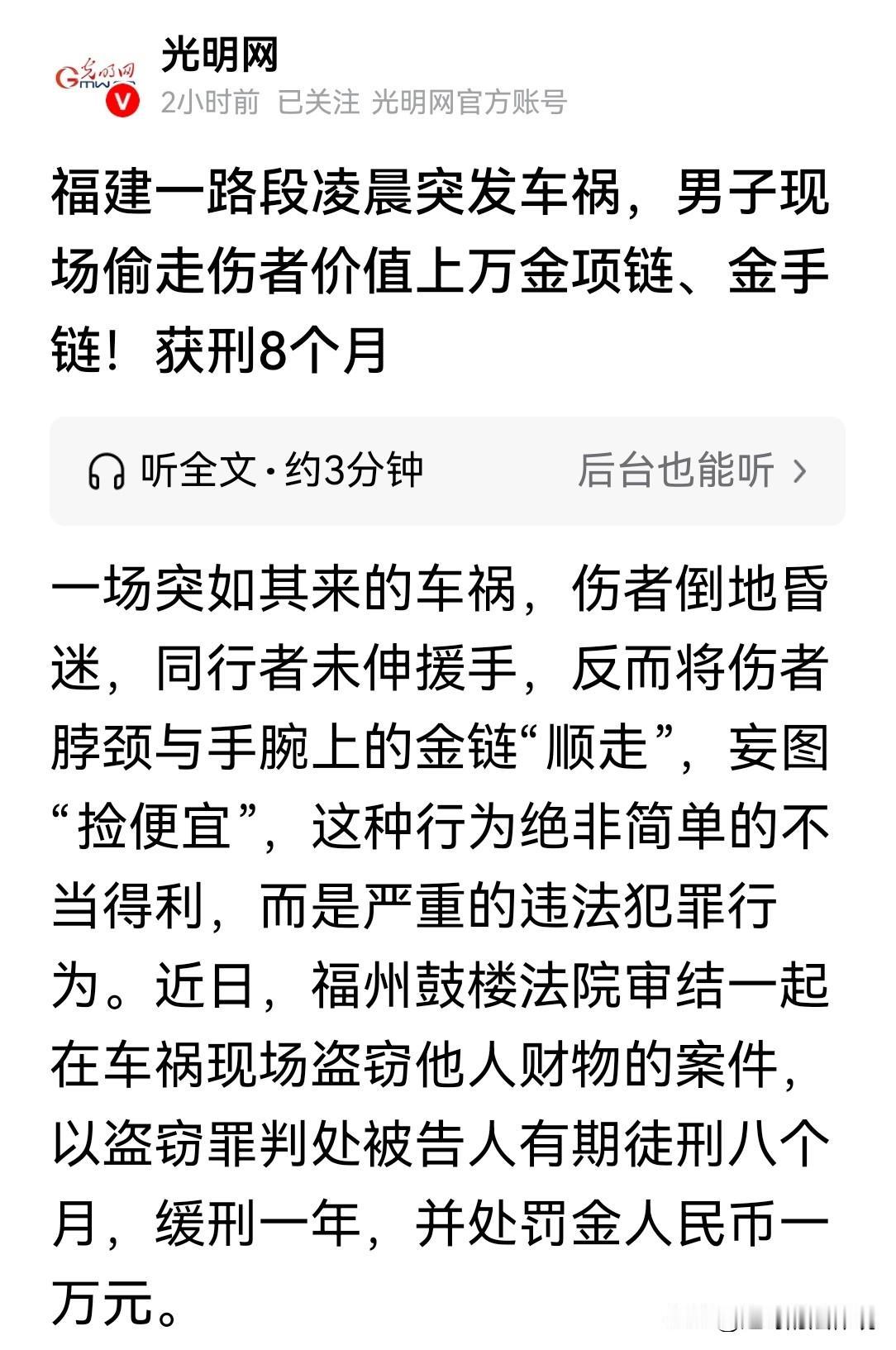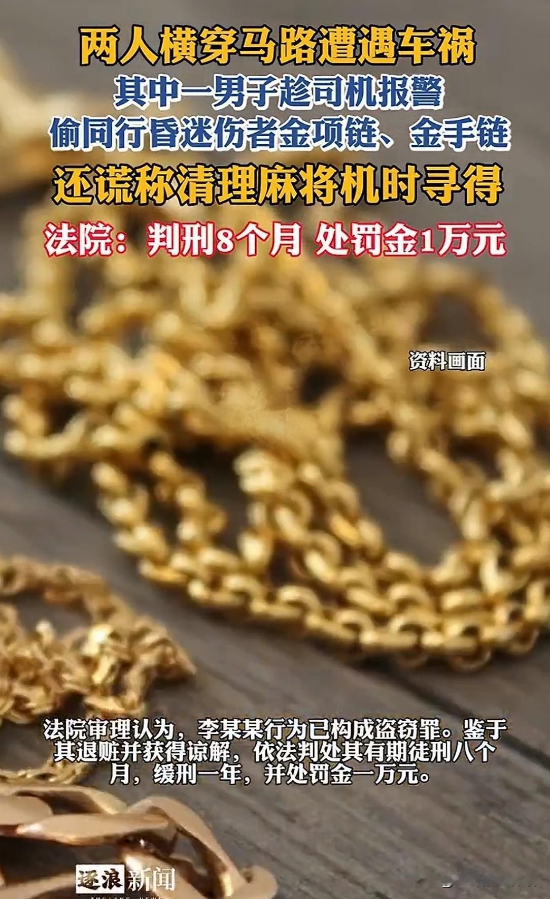 没有人味!福建福州,一男子横过马路时,亲眼看目睹同行的熟人,被一辆轿车撞飞生命垂危。他没有救人,而是趁机偷走价值1.8万多的黄金项链和手链。伤者家属发现金首饰丢失,要报警处理,男子害怕被抓,把项链还给了家属,但仍企图占有金手链,直到5天后才又交还给家属。网友:趁人之危,应罪加一等! 2025年8月4日,一场突如其来的车祸,发生在深夜。 当时,李某某正和赵某某一起横穿马路。 突然,一辆小轿车飞驰而来,“砰”的一声,赵某某被狠狠地撞了出去。 赵某某整个人重重地倒在地上,人陷入了重度昏迷。 这突如其来的变故,人们都惊呆了。 小轿车司机谢某也被吓得不知所措,但他很快反应过来。 他掏出手机打电话报警,同时匆忙拿出警示标志,摆放在事故现场周围。 和赵某某同行的伙伴李某某,此时本应伸出援手。 或是帮忙照顾伤者,或者协助司机处理事故。 可他此时,心里却打起了歪主意。 他看着昏迷不醒的赵某某,目光落在了他的金项链,和金手链上。 黄金项链和手链,在路灯的映照下,散发着诱人的光泽。 晃得李某某竟一时昏了头脑。 他和赵某某平时一起打麻将,就羡慕赵某某穿金戴银的富足生活。 现在,赵某某人出了车祸,陷入昏迷、生死未卜,正好旁边又没人。 于是,一个罪恶的念头在李某心里产生,贪婪的欲望一个劲的驱使着他。 最终他趁着司机忙于报警和摆放警示标志时。 快速取下赵某某的黄金项链,和黄金手链,藏进了自己的袋子里。 事故发生后,赵某某的家属,心急如焚地赶到了现场。 他们看着昏迷不醒的赵某某,心都碎了。 在救援的过程中,他们突然发现赵某某脖子上的黄金项链不见了。 这条项链,对赵某某来说意义非凡,是家人送给他的重要礼物。 家属们四处寻找,并没有找到项链的下落。 家属又气又急,就放狠话,找不到这条黄金项链,就报警处理! 李某某在一旁听着家属的话,心里“咯噔”一下,开始害怕起来。 他明白,这事早晚查到自己头上。 他觉得,不能让事情败露,于是绞尽脑汁想出了一个自以为聪明的注意。 事故发生第2天,他装作若无其事的样子,找到对赵某某的家属。 他自称,昨天回到事故现场的时候,看到地上有一条金项链,想应该是赵某某的,现在还给你们。 他从口袋里掏出那条黄金项链,递给了家属。 家属们看到失而复得的项链,虽然有些疑惑,但并没顾得上深究,还对李某表示了感谢。 然而,事情并没有就此结束。 2025年8月10日,赵某某的家属又发现,他左手手腕上的黄金手链也不见了。 这条手链同样价值不菲,而且也是赵某某的心爱之物。 家属再次陷入了焦急之中,他们开始怀疑李某某。 只有他是和赵某某同行的人,而且之前项链失踪的时候,他也有可疑的表现。 家属找到李某某,询问他是否看到了赵某某的黄金手链。 李某某一开始还嘴硬,装作一脸无辜,称会不会是掉在事故现场的其他地方了。 但家属们并不相信他的话,继续追问。 李某某见事情快要瞒不住了,心里十分慌张,又编了一个谎言。 此日,他找到家属说,自己在家清理麻将机的时候,在麻将机下面,发现了这条黄金手链。 应该是赵某某之前不小心掉在那里的,他把黄金手链还给了家属。 但家属们越想越觉得不对劲,他们觉得李某某的行为太可疑了。 而且这些黄金首饰失而复得,都和李某某有关联。 他们怀疑就是李某某偷走了项链和手链。 家属果断选择了报警,警方介入后,通过调取事故现场周围的监控录像。 以及对李某某的询问和调查,很快就掌握了确凿的证据。 所有证据,都指向了李某某,在车祸现场偷走了赵某某的项链和手链。 经鉴定,被盗的黄金项链,贵金属含量Au99.9%,重量10.195g; 黄金手链贵金属含量Au99.9%,重量12.616g,价值18363元。 2025年8月11日当天,警方就将李某某抓获归案。 面对警方的质问和确凿的证据,李某某终于低下了头,承认了自己的犯罪行为。 他后悔不已,自己一时鬼迷心窍,觉得黄金首饰值钱,就想着占为己有。 案发后,他真诚地向赵某某的家属道歉,希望能得到他们的谅解。 赵某某的家属,最终选择了原谅他。 那么法院会怎么判呢? 《刑法》第264条:盗窃公私财物,数额较大或者多次盗窃的,处3年以下有期徒刑、拘役或者管制,并处或者单处罚金…… 法院经审理认定,李某某这不是捡漏,而是偷窃。 伤者虽然昏迷,但东西仍戴在他身上,法律上属于他的财产,不是无主物品, 李某某趁赵某某车祸昏迷,偷走其黄金项链和手链,属于盗窃行为。 根据法律规定,李某某盗窃财物价值18363元,达到了数额较大标准。 法院综合考虑,李某某能如实供述、认罪认罚、退还赃物,并取得家属谅解等情节。 最终,法院判决,李某某有期徒刑8个月,缓刑1年,并处罚金10000元。 对此,你怎么看?