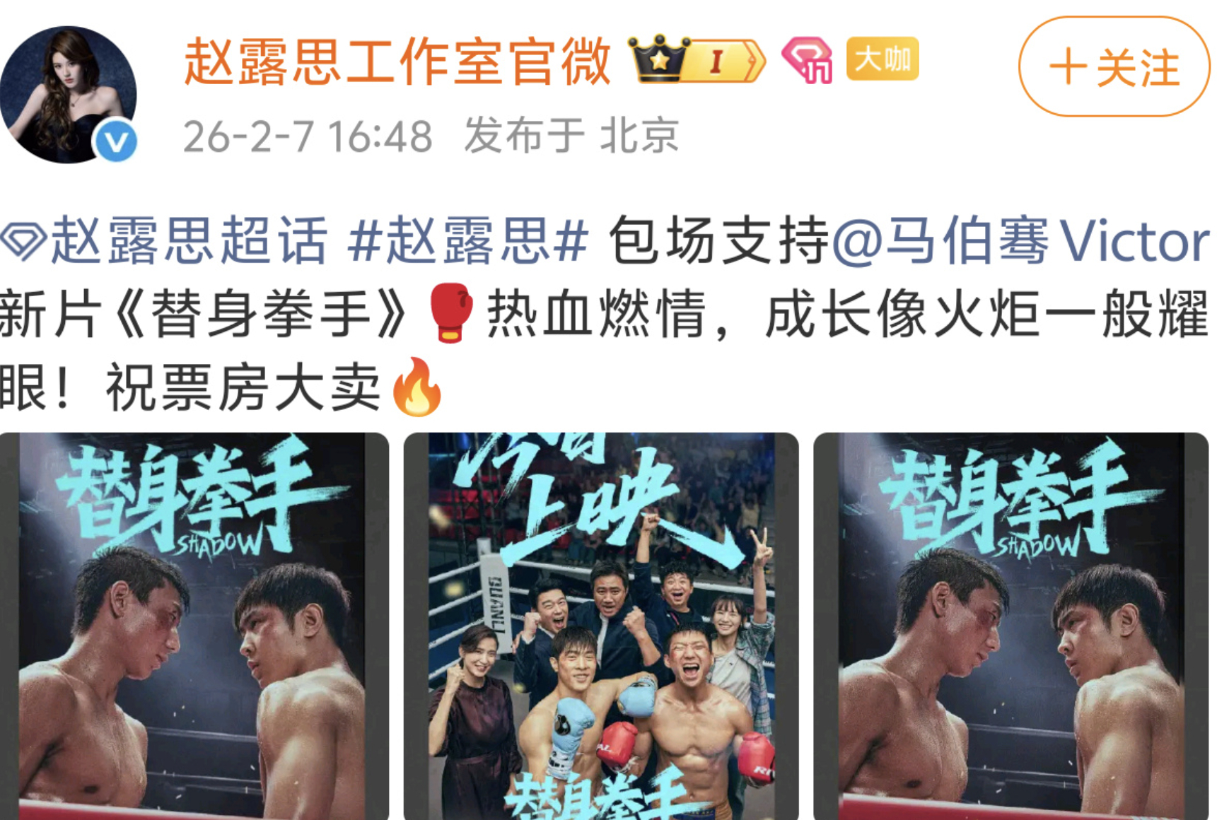 赵露思工作室也支持马伯骞新电影,文案说的不是电视剧。