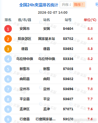 而在北方地区,今天白天在冷空气主体南下后,光照加热之下,多地开始升温。河北安国升8.8℃,山西阳泉升8.4℃,内蒙古乌拉特中旗升8.2℃,河南新密升8℃,为各自省区14时升温最强站点。
