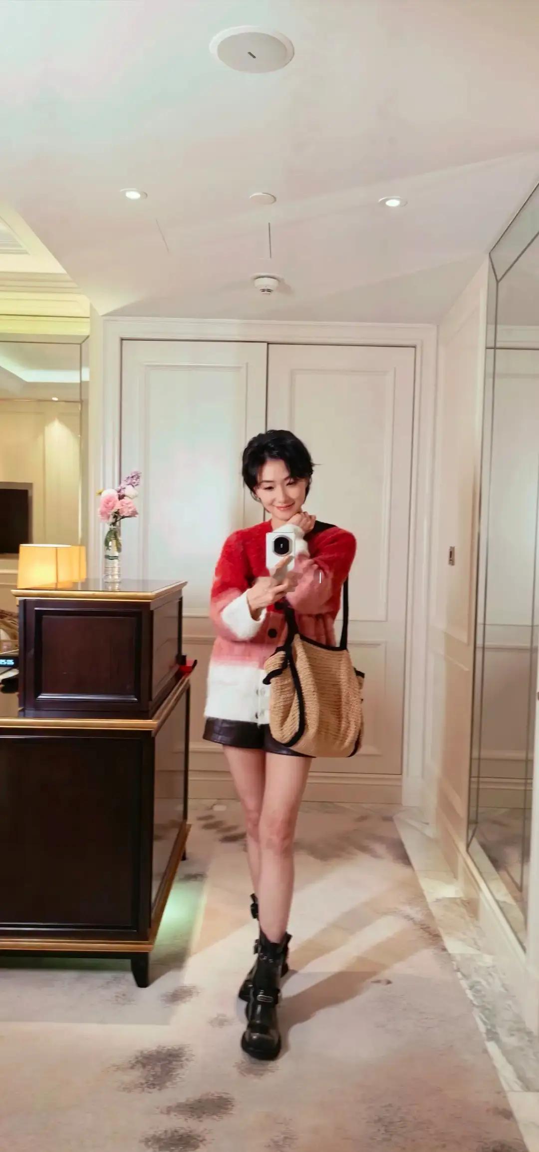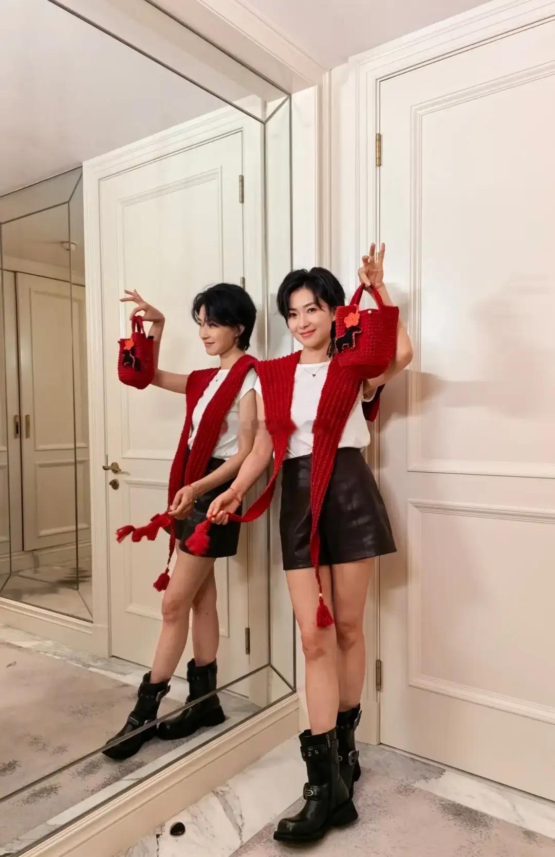 万茜身着皮短裙搭配皮靴,颈间围着妈妈新织的红色披肩围巾,利落中透着温暖,时髦又亮眼,美得让人移不开眼。