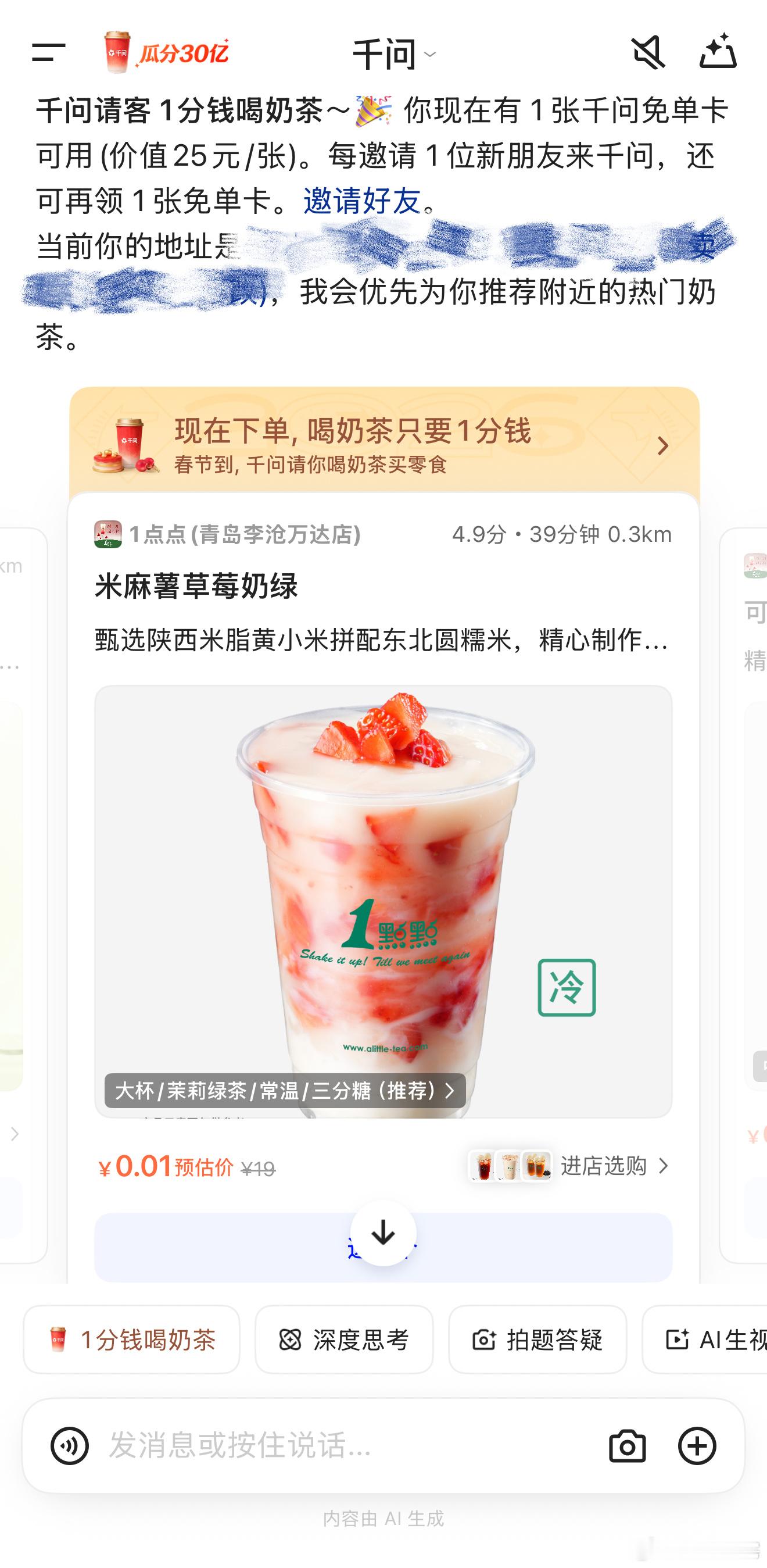 不得不说,千问这次是真拼了,这就AI送给人们的第一个新春大礼包吗?不仅可以买奶茶,甚至可以去盒马鲜生购置年货。真的是太方便了。