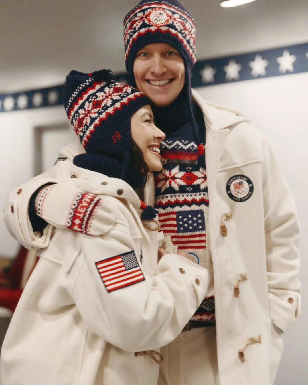 作为东道主,意大利代表团的服装由阿玛尼EA7倾力打造,整体以纯净的乳白色为主调,完美呼应阿尔卑斯雪山的清冷质感,仅用国旗红绿两色做低调刺绣点缀,利落修身的剪裁摒弃了羽绒服的臃肿感,搭配精致立体的字母标识与暗藏国歌歌词的内衬,将意式极简高定的优雅与仪式感拉满,兼具科技保暖与高级审美,尽显米兰作为时尚之都的底气。中国代表团本次服装跳出传统配色,以冰穹蓝与雪山白渐变为主调,男生沉稳宝蓝、女生清新浅蓝,宛如冬日里的青花瓷,东方韵味十足。设计融入汉代双胜纹经典纹样,结合雪花与反光字母细节,内敛又不失辨识度,内里还暗藏中意两地地标图案,文化交融感满满,同时搭载硬核保暖科技,轻盈抗寒,把东方美学与现代运动机能平衡得恰到好处。美国队依旧是经典的Ralph Lauren美式复古风,以红白蓝国旗色为基底,羊毛大衣搭配提花毛衣,学院感十足,分层结构与自发热面料兼顾温度与风度,复古腔调中透着年轻活力。