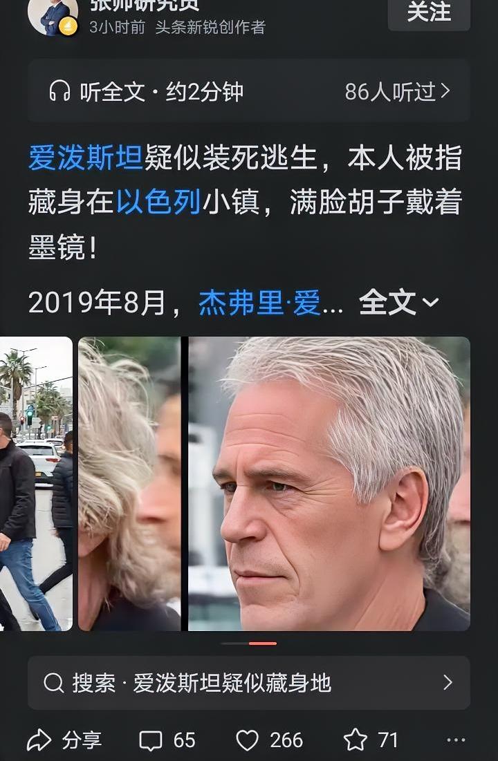 爱泼斯坦装死逃生,藏在以色列小镇?假的!至少目前广为流传的这张图已被证实是人工智能(AI)生成的假图,并非爱泼斯坦本人。 已有多家权威机构(如PolitiFact)此进行了辟谣。而且看图一路牌上的文字模糊不清,一看明显就是AI风格。 但是关于“爱泼斯坦还活着”这种说法是否属于阴谋论,还是疑点重重! 随着美国司法部近期公布的爱波斯坦文件流出,其中2月5号被扒出来的一段监控画面显示,就在爱波斯坦死亡的当天晚上,有一个身份不明、身穿橙色连体衣的身影进入号称全面封锁的牢房区域。这与监狱此前坚称的“无任何人进入该区域”说法不符,更吊诡的是那段时间的完整监控视频官方未能提供,而是以“技术故障”这个理由唐塞过去了!这种自相矛盾和疑点重重的解释,自然难以令人信服,也加剧了人们怀疑爱泼斯坦是金蝉脱壳,装死逃生的推测。 爱泼斯坦案件越来越有意思了,随着300万份文件的公布,西方民众的怒火对准了美西方权贵圈子。但是很快就传出这跟普京有关,说爱泼斯坦是俄罗斯间谍,接着又有传言说爱泼斯坦是以色列摩萨德。最近又突然莫名其妙地流出一张照片,说是有人在以色列某个小镇拍的疑似爱泼斯坦本人照片,然后紧接着又有多家权威公司出来辟谣,说这明明就是一张AI合成图片。 一番操作下来,让人看的眼花缭乱,先让人们相信爱泼斯坦还活着,接着立马证伪,那是不是这样就可以真正的做到让爱泼斯坦死里逃生,以后哪怕他真被拍到再也不会引起大众的关注了呢? 如果这招不灵,他们还有后手,就是他们已经明里暗里把爱泼斯坦塑造成克格勃或者摩萨德了。哪怕以后真的被大众发现爱泼斯坦还活着,美西权贵圈子也可以以此为由,说爱泼斯坦所做的一切是受俄罗斯或者以色列指使,跟美国没有关系,美西方那些权贵也是爱泼斯坦案的受害者…… 问题是现在出了这么大洋相,数百万份文件,文字、图片、视频都有,人们还会相信他们的鬼话吗?