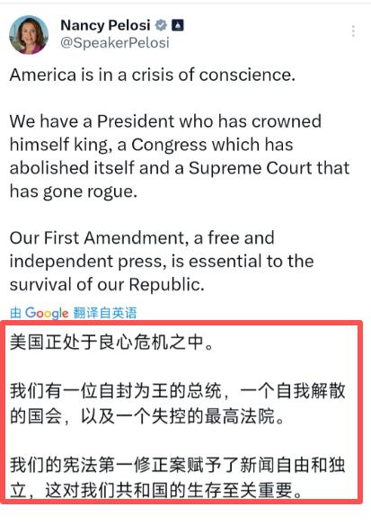 忍不了了,佩洛西“炮轰”特朗普! 美国前众议长佩洛西2月5日发文说:“美国正处于良心危机之中。我们有一位自封为王的总统,一个自我解散的国会,以及一个失控的最高法院。” 85岁的佩洛西,在政坛摸爬滚打近40年,是美国历史上首位女性众议院议长,说话向来有分量。她这番话绝非随口抱怨,字字带火,撕开了美国当下最真实的乱象,很快就在全美炸开了锅。 佩洛西与特朗普的恩怨早已深入骨髓,此次发文更是她不满情绪的总爆发,每一句指责都有迹可循。 佩洛西口中“自封为王的总统”,直指特朗普无疑。特朗普向来行事张扬、独断专行,其首个总统任期内,就与佩洛西闹出诸多针锋相对的名场面。 最令人印象深刻的是2020年2月4日,特朗普在国会发表国情咨文,佩洛西主动伸手示好却被无视;演讲结束后,佩洛西当众将演讲稿副本撕成两半,直言整篇讲稿满是谎言,特朗普谎称保护民众医疗保险,背地里却在推动推翻相关保护条款,这样的行为让她无法容忍。 佩洛西对特朗普的不满远不止于此。特朗普首个任期内,佩洛西曾两度主导弹劾他,让其成为美国历史上首位任期内两度遭弹劾的总统,一次因“滥用总统职权”“妨碍国会调查”,另一次则因“煽动叛乱”。 佩洛西曾公开表示,特朗普的话里充满虚假与夸大,与其讨论问题,首要之事是理清事实。 如今特朗普再度活跃政坛、筹备选举,其激进政策与独断风格再度引发佩洛西不满,“自封为王”的评价,正是对他无视国会、不顾民众意愿、独断专行的尖锐批判。 再看“自我解散的国会”,更是戳中美国政治的痛点。如今的美国国会,早已不是为民众谋福利、为国家定方向的机构,而是两党争斗的战场。 当前共和党与民主党在众议院议席差距极小,参议院共和党虽占微弱优势,但两党分歧已不可调和。 此前特朗普弹劾案中,共和党参议院无视75%民众认为特朗普行为错误的民意,无视宪法责任,压制证据、拒绝公平司法程序,最终判定特朗普无罪,佩洛西当时就指责共和党参议院无法无天,沦为特朗普的同谋。 随着2026年中期选举临近,两党争斗愈发激烈,共和党内部也因特朗普陷入严重内耗。特朗普凭借自身影响力干涉共和党内竞,极力扶持亲信、排挤异己,导致共和党无法团结一致备战选举,陷入自相残杀的困境。 而两党之间更是针锋相对、互不相让,无论经济政策、民生福利还是对外立场,均奉行“对手支持即反对”的原则,全然不顾国家利益与民众需求。 这样的国会看似正常运转,实则早已丧失应有功能,陷入“自我解散”的状态——没有共识、没有行动,只剩无休止的争吵内耗,根本无法解决国家实际问题。 最后是“失控的最高法院”,这同样是美国政治乱象的重要体现。最高法院本应是公平公正的象征,负责维护宪法权威、制衡行政与立法分支,但如今却愈发偏向党派立场,丧失了应有的中立性。 近年来,最高法院多起争议判决均带有明显党派倾向,涉及选举、民生福利等领域的判决常引发民众不满与抗议,民众对其信任度大幅下降。 佩洛西口中的“失控”,正是指最高法院不再受制衡、不再为全体民众服务,反而沦为党派争斗的工具,背离了初心使命。 其实佩洛西这番话,并非故意唱衰美国,而是深耕政坛四十年的老者,见证国家混乱衰败后的痛心疾首。 85岁的她,见过美国政坛的相对有序,也经历过两党的良性博弈,如今看到总统独断、国会内耗、最高法院失序,民众深陷高通胀、高生活成本的困境,才忍不住发出呐喊。 或许有人会认为,佩洛西作为民主党人,批评特朗普带有党派偏见,但不可否认的是,她所说的每一点,都是美国当下最真实的乱象。两党争斗不休、权力失衡、民众利益被忽视,这样的美国,确实陷入了佩洛西所说的“良心危机”。 佩洛西的炮轰,与其说是针对特朗普个人,不如说是对美国当下政治生态的不满与控诉。美国未来能否摆脱乱象、走向何方,无人能给出确切答案,但佩洛西的这番话,无疑为所有美国人敲响了警钟——持续内耗、无视民意,只会让国家愈发混乱,“超级大国”的光环也终将逐渐褪去,这并非某个人的过错,而是美国政治体系失衡、两党争斗不休的必然结果。