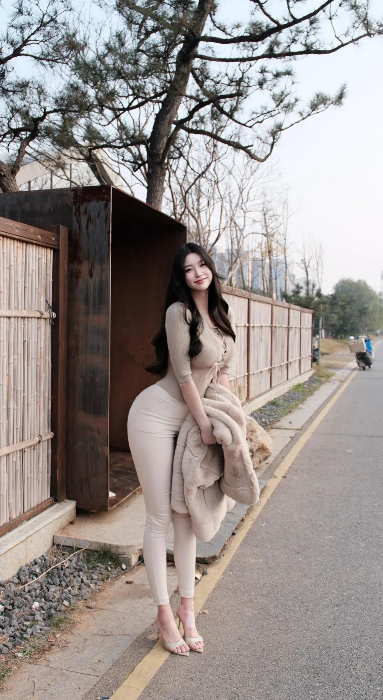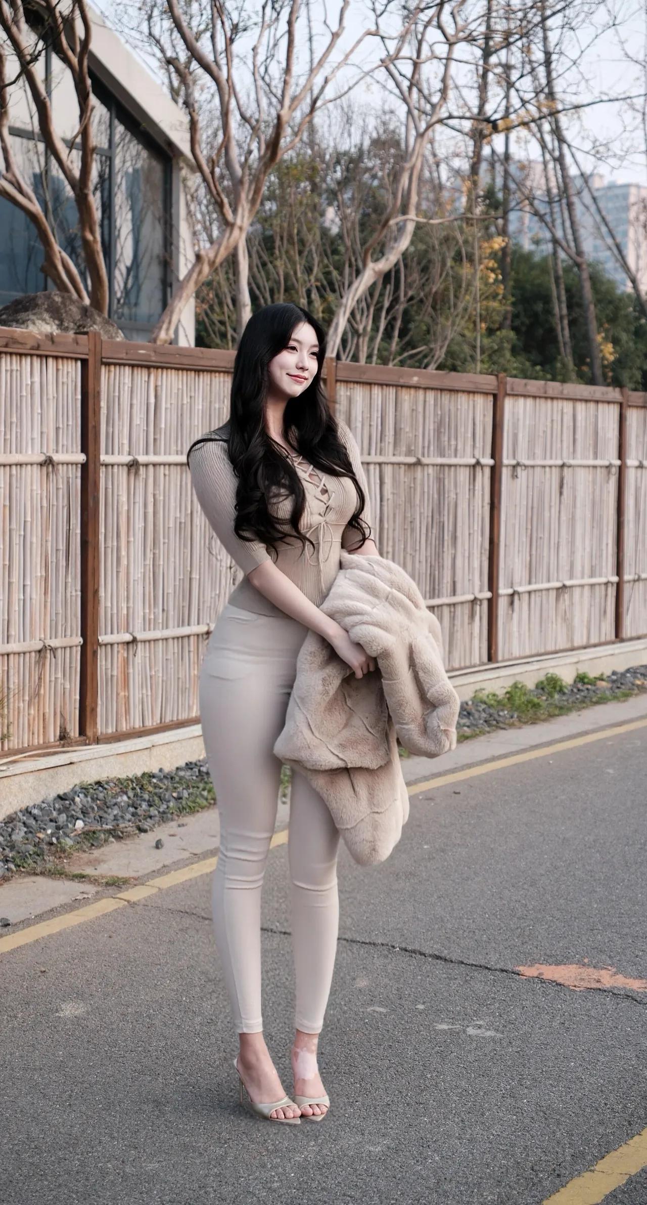美图欣赏,看图写诗,情感解读 《晴隅闲步》 婉约古风: 素衣曳影踏晴光, 竹院松风送浅香。 回首嫣然春欲动, 一颦一笑惹神伤。 现代诗意: 浅棕针织衫裹住午后的风, 皮草搭在臂弯, 像拥着一团软云。 竹篱、老松、空荡的长街, 你的回眸, 是季节最暖的停顿。 清丽短句: 晴光漫过竹篱,衣袂沾了松风。 转身的瞬间,温柔了整条街。 情感解读: ​她身着素衣,身姿窈窕,不刻意张扬,却自有动人风情。 其美在骨不在皮,是步态间的舒展,是回眸时的温柔,是将性感融于松弛的从容。 这份不刻意的美,恰如春风拂过心湖,让人在不经意间便为之沉醉。 治愈系 ​图片来源于网络,侵删