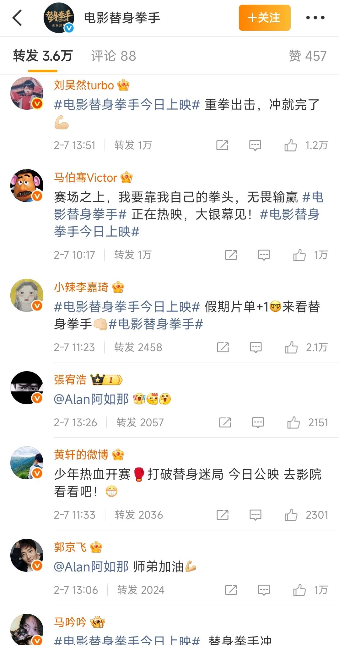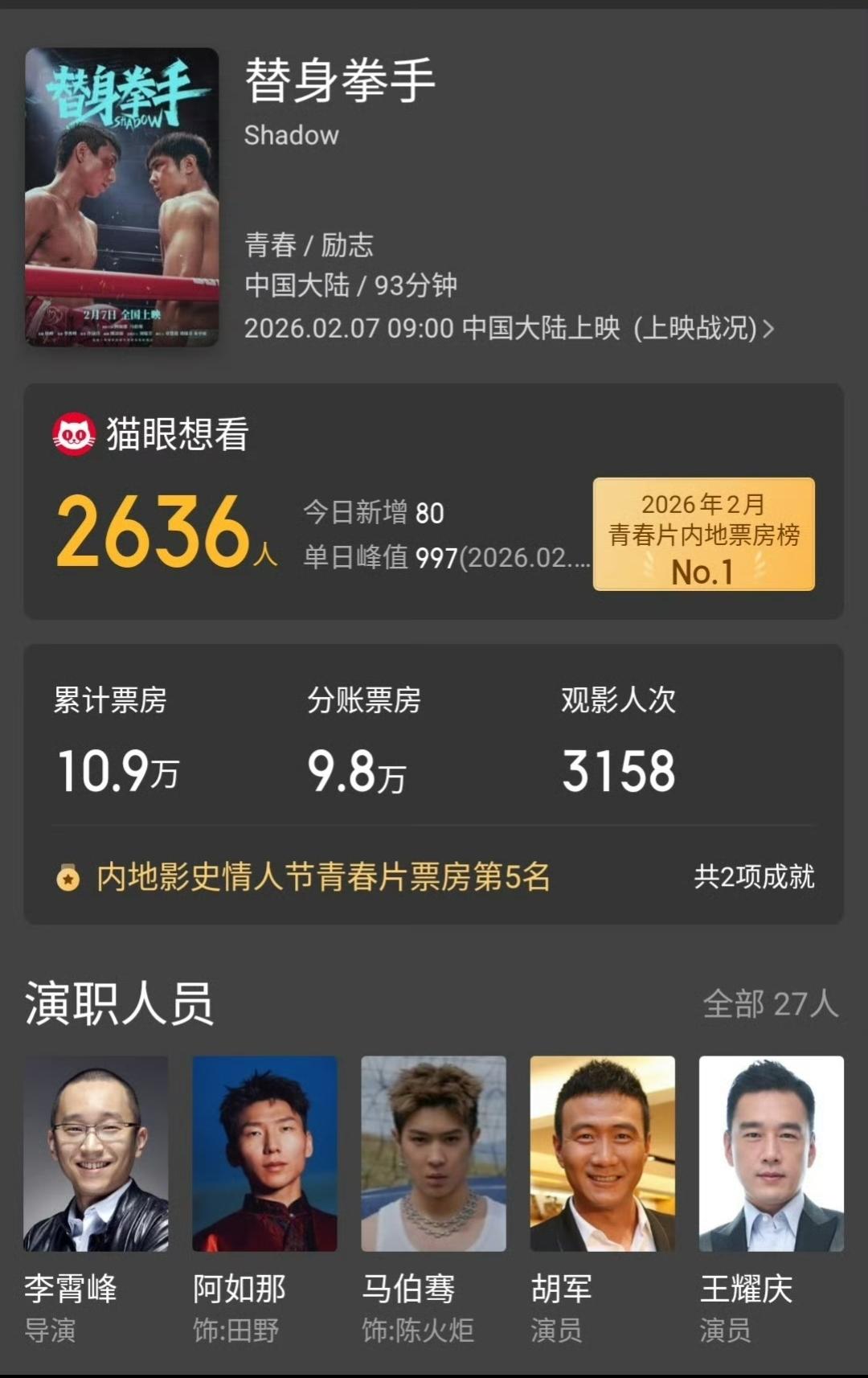 枉费了娱乐圈这么多明星转发呀。 我看了一下这个电影替身拳手,大导演徐峥的力作。 几乎半个娱乐圈都过来捧场,评论区里铺天盖地都是大明星,甚至有赵露思肖战等人帮着包场。 然后我再一看,票房只有10万多。 10万多的票房啊,转发里这些明星随便一个拎出来,广告费都得超10万了吧? 这么多明星帮着宣传,流量按理说早应该起飞了,怎么票房这么差呀?