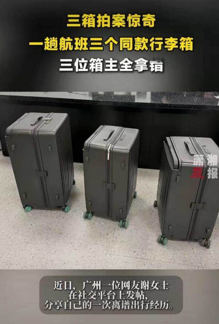 近日,广州白云机场,发生一起3人互相拿错行李箱的乌龙事件。 谢女士2月5日乘坐的航班准时降落广州白云机场,在行礼转盘区找到了自己的行李箱。但是回到家才发现,此行李箱根本不是自己的 ,谢女士赶紧联系机场警务处。此时谢女士也接到了A女士打来的电话,说他们的行李箱拿错了,并相约在机场见面,换回各自的行李箱。 正当谢女士准备前往机场时,又接到机场警察打来的电话,称B女士拿了自己的行李箱,要求谢女士到机场和B女士互换。谢女士这下彻底懵圈了,怎么又冒出一个B女士,到底怎么回事?谢女士带着疑惑赶到了机场。 在机场警务室,谢女士见到了A女士、B女士。在警察的介绍下,终于复盘了事情的真相,也当着警察的面各自换回了自己的行李箱。 原来,乌龙的发生是一起惊人的巧合——谢女士、A女士和B女士不但同乘一次航班,更巧合的是3人的行李箱也是同款,而且颜色一致!取行李箱时没有仔细核对。谢女士拿错A女士的,A女士拿错B女士的,B女士拿错谢士的,3人之间的连环乌龙,形成闭环错位。 网友调侃“过程好笑又离谱,还得去机场认亲” 出门在外,难免会有疏忽大意的时候。现在同款同色的行李箱很多,为了避免拿错行李箱带来的麻烦,最好在自己的箱上贴上标签,并在取件处打开行李箱仔细核对箱内物品,确保万无一失。 你还会有什么样的宝贵经验吗?期待你的高见。